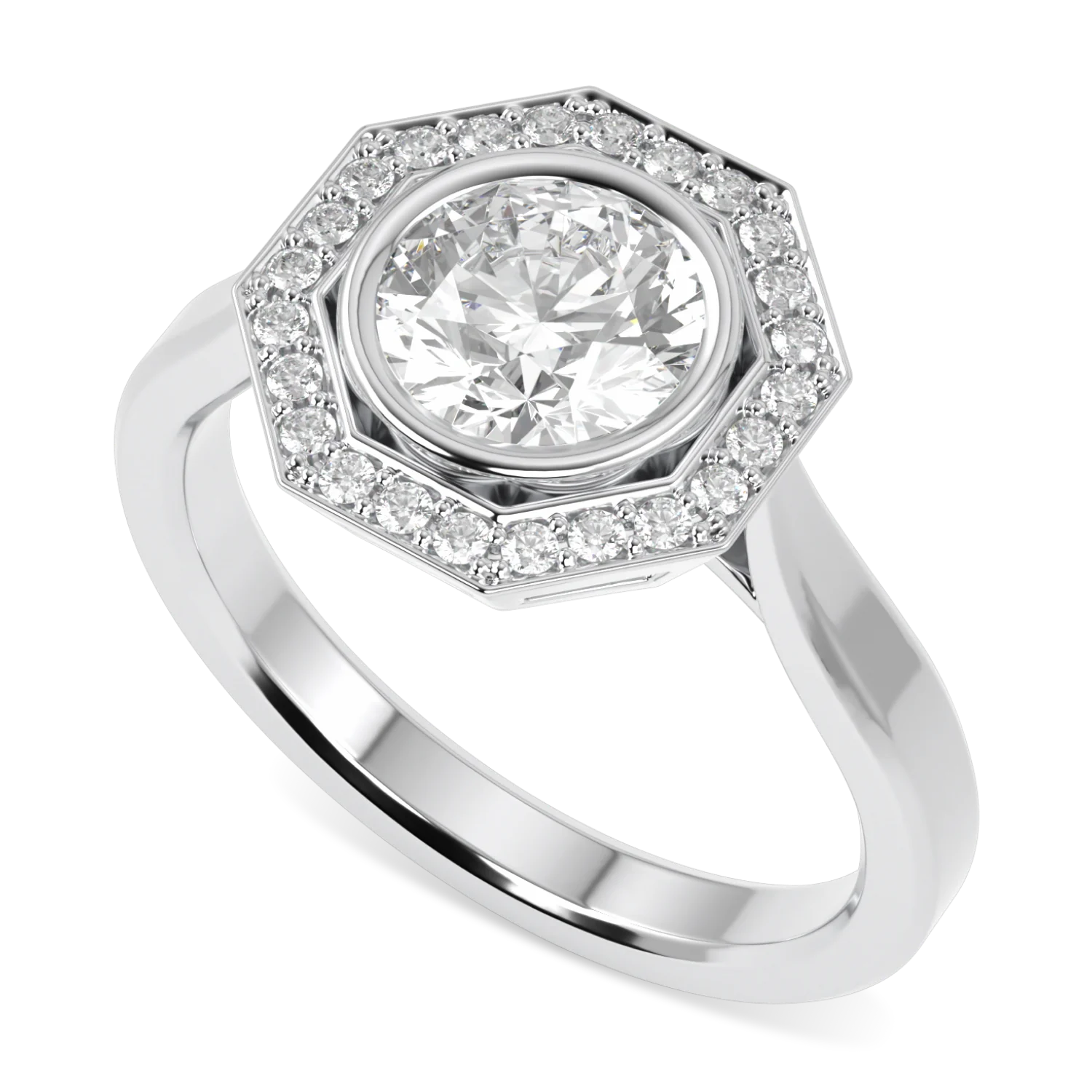 The collection plays off this ideal, with a creative expression of precision facet alignment embodied through an elegant octagonal halo and bevelled edged shank with a perfectly cut diamond at the centre. A true celebration of the Blacklock love of a perfect cut diamond.