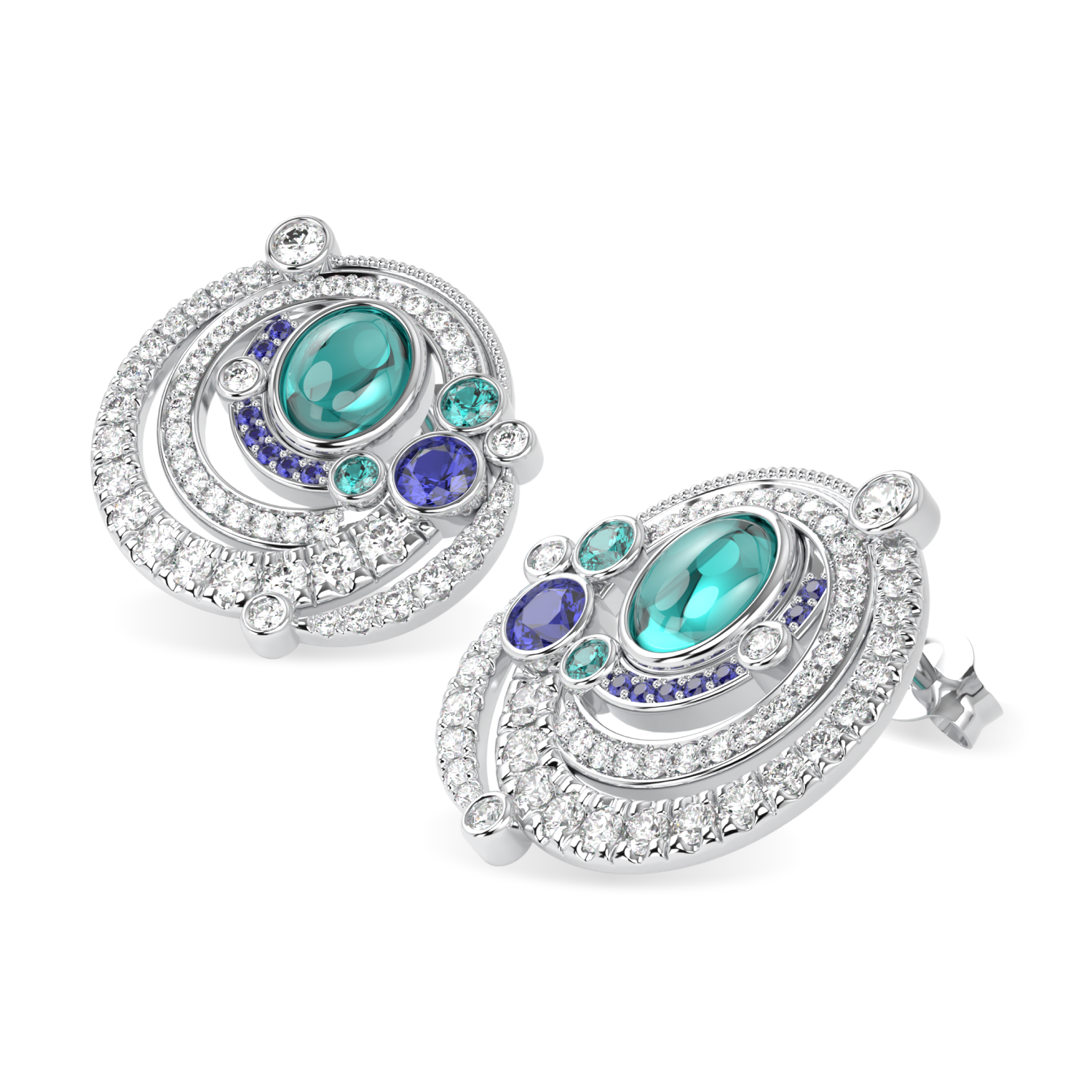 Inspired by the Corryvreckan Whirlpool in the Western Isles of Scotland, this piece features multiple enchanting interwoven circles that beautifully showcase two magnificent cabochon-cut Paraiba tourmalines, set amidst intricate swirls of micro set diamonds and sapphires.