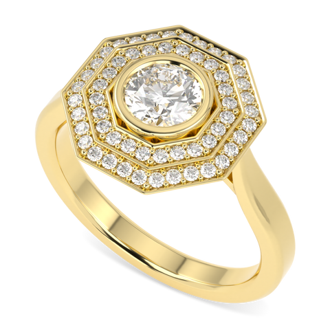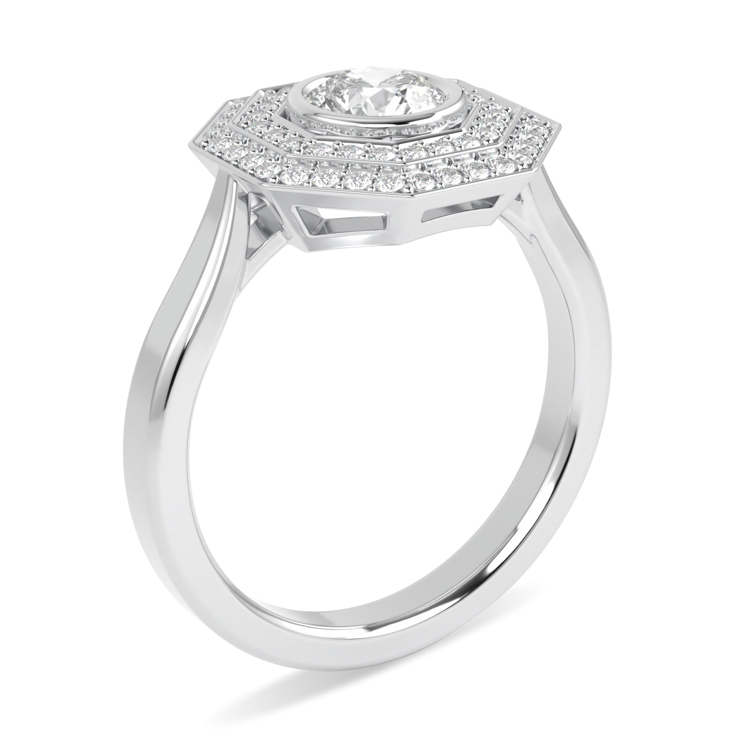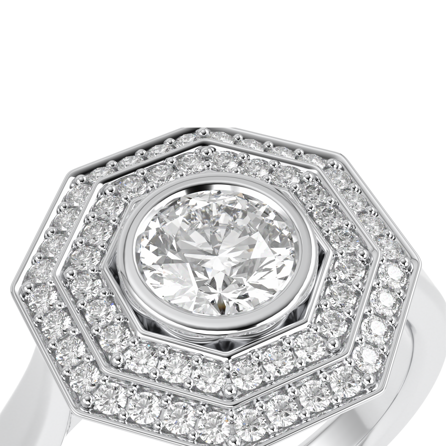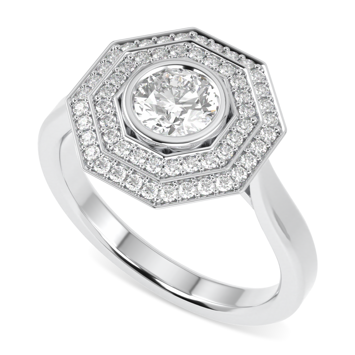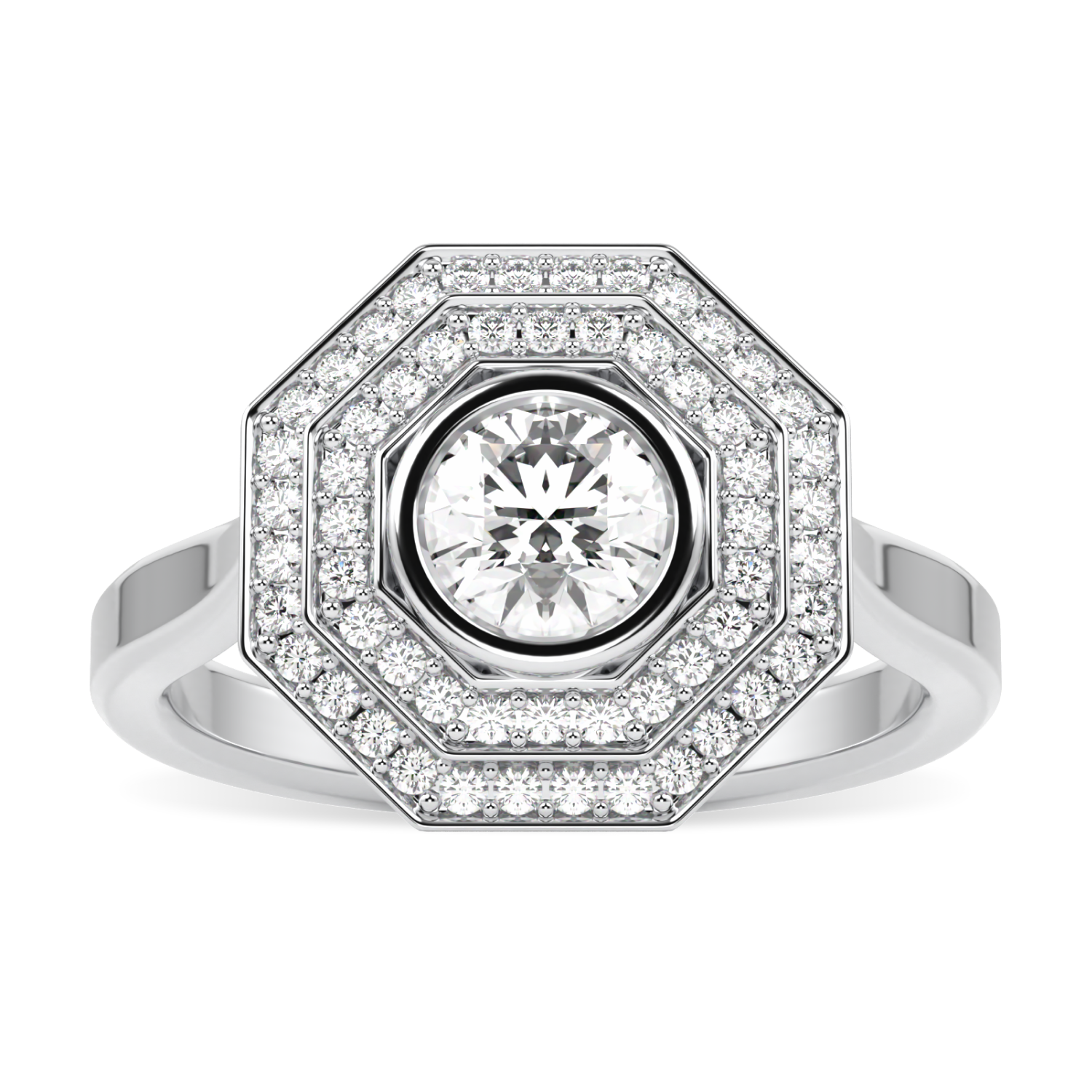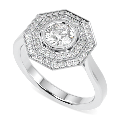 The Brilliance 40 double diamond octagonal halo brings heightened drama to an already unique design which echos the perfectly aligned facets of a exceptionally cut round brilliant cut diamond. The combination of angular and circular forms harmonize beautifully, elevating the overall appeal of this statement ring. The central certificated 0.50cts round brilliant cut diamond is of G colour and VS1 clarity with EX/EX/EX cut grade. All on a platinum bevelled edged shank.