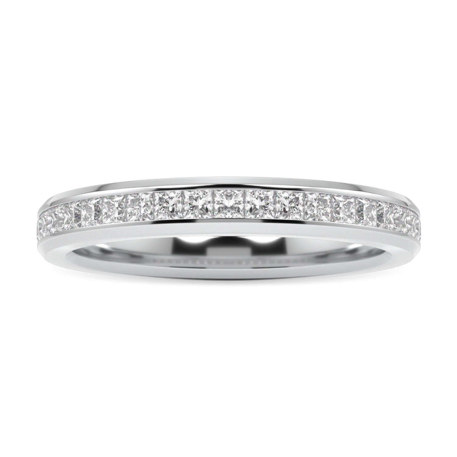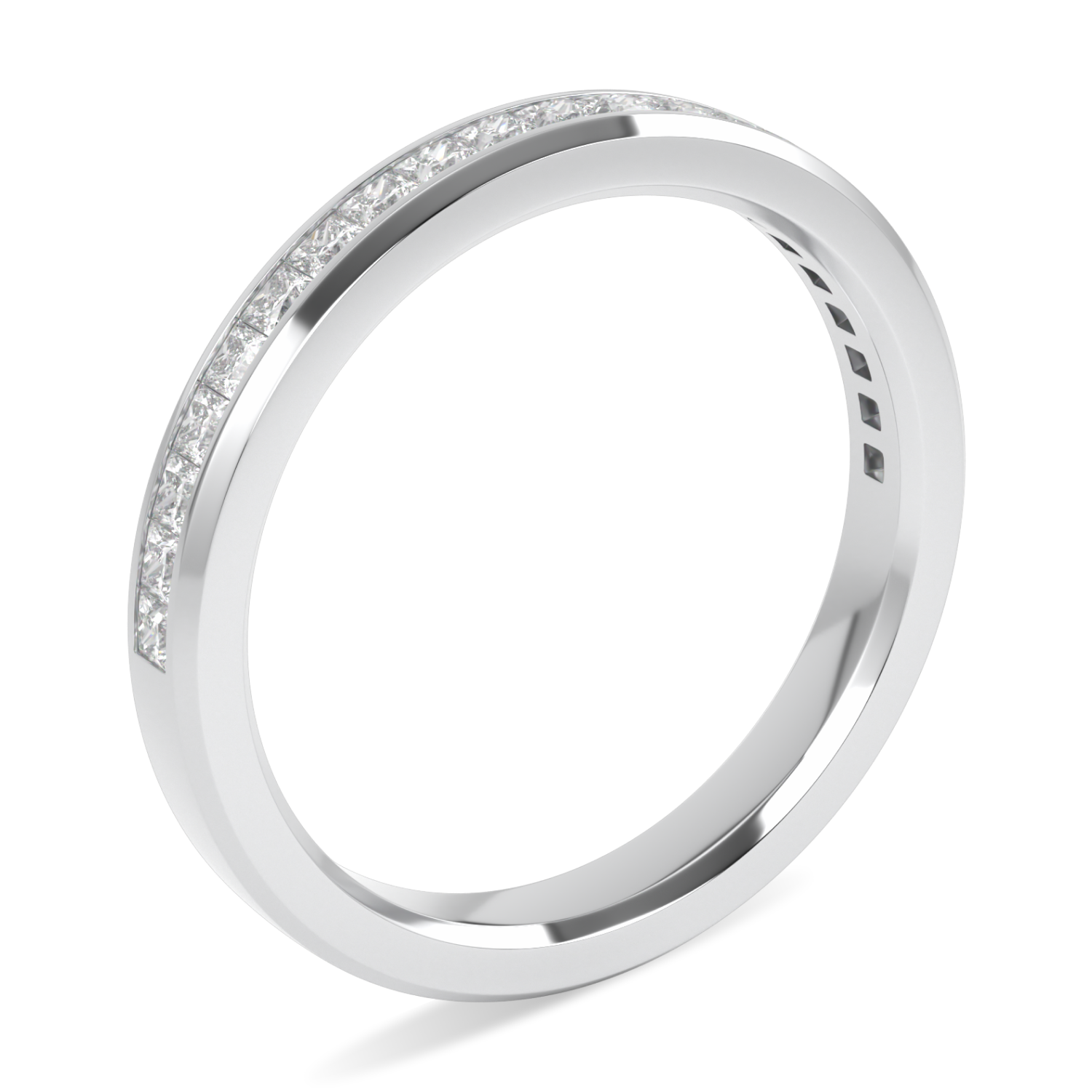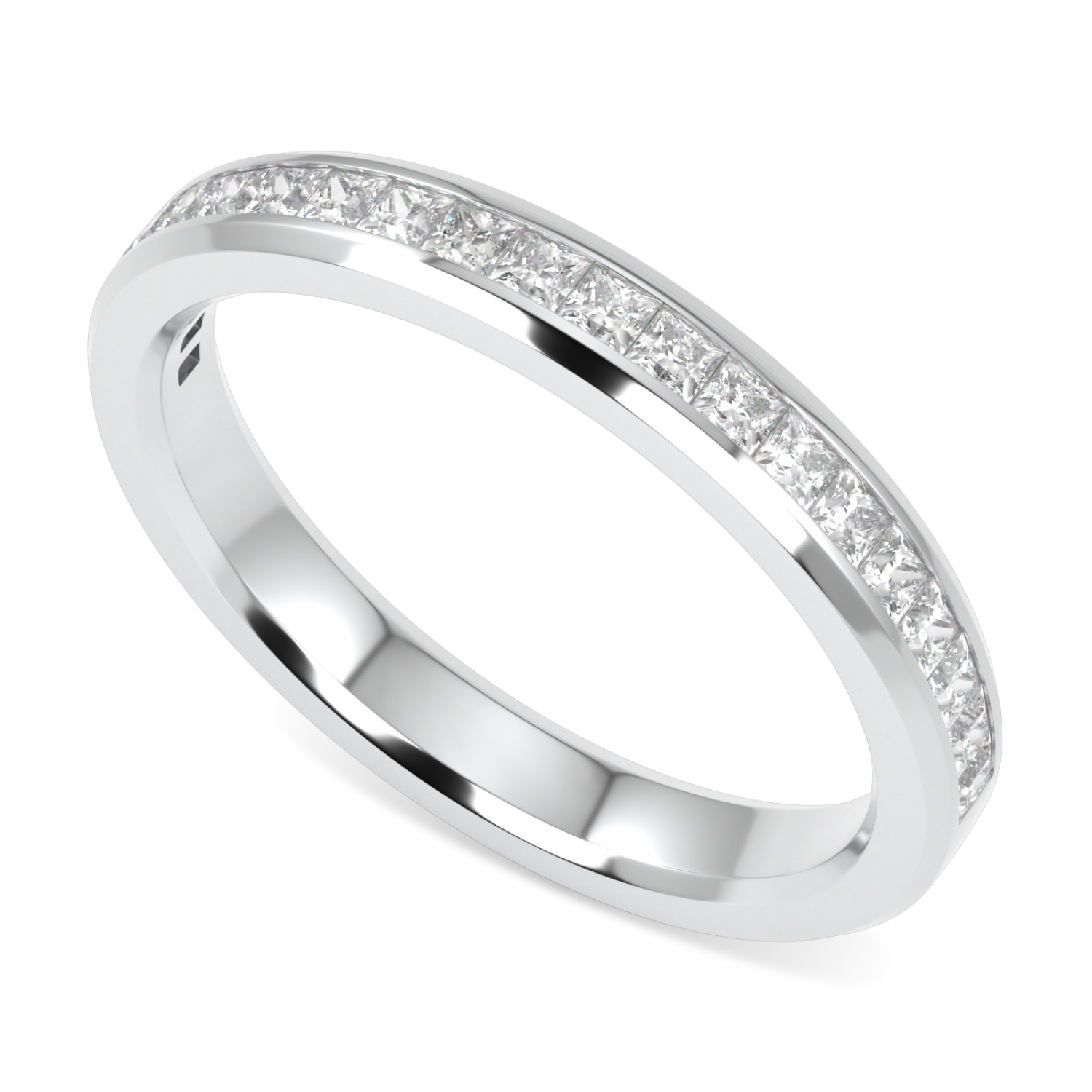 The Brilliance 40 diamond band showcases 0.31 carats of princess-cut diamonds invisibly set in a platinum band with finely beveled edges. Diamond coverage of half of the shank. The band can be worn alone or with any octagonal halo ring variant. All set in platinum.