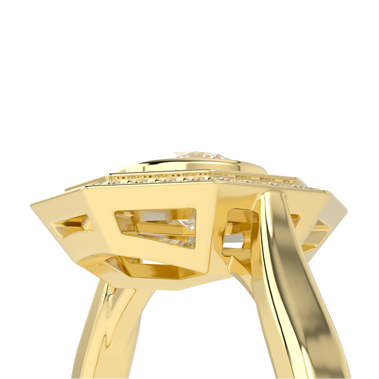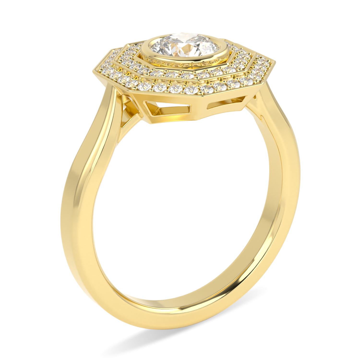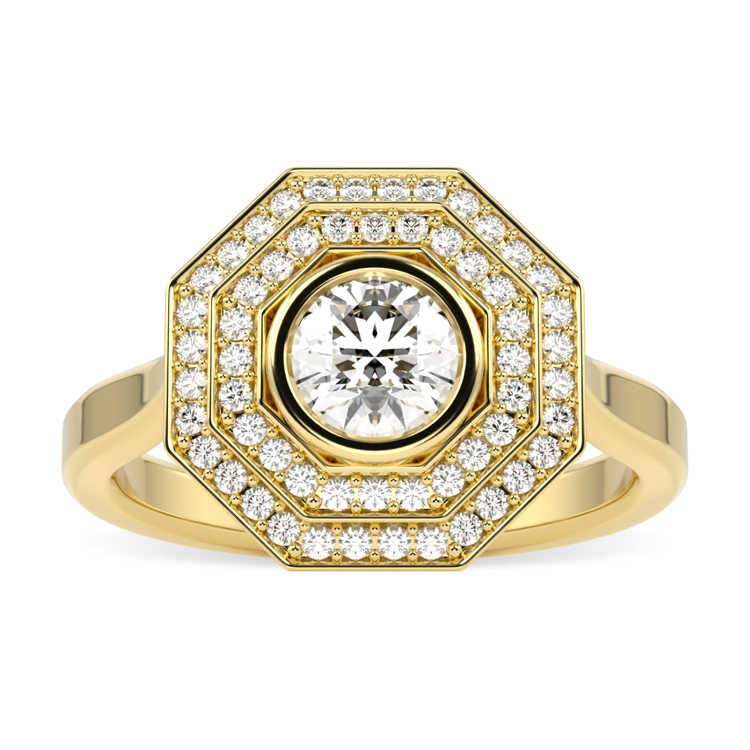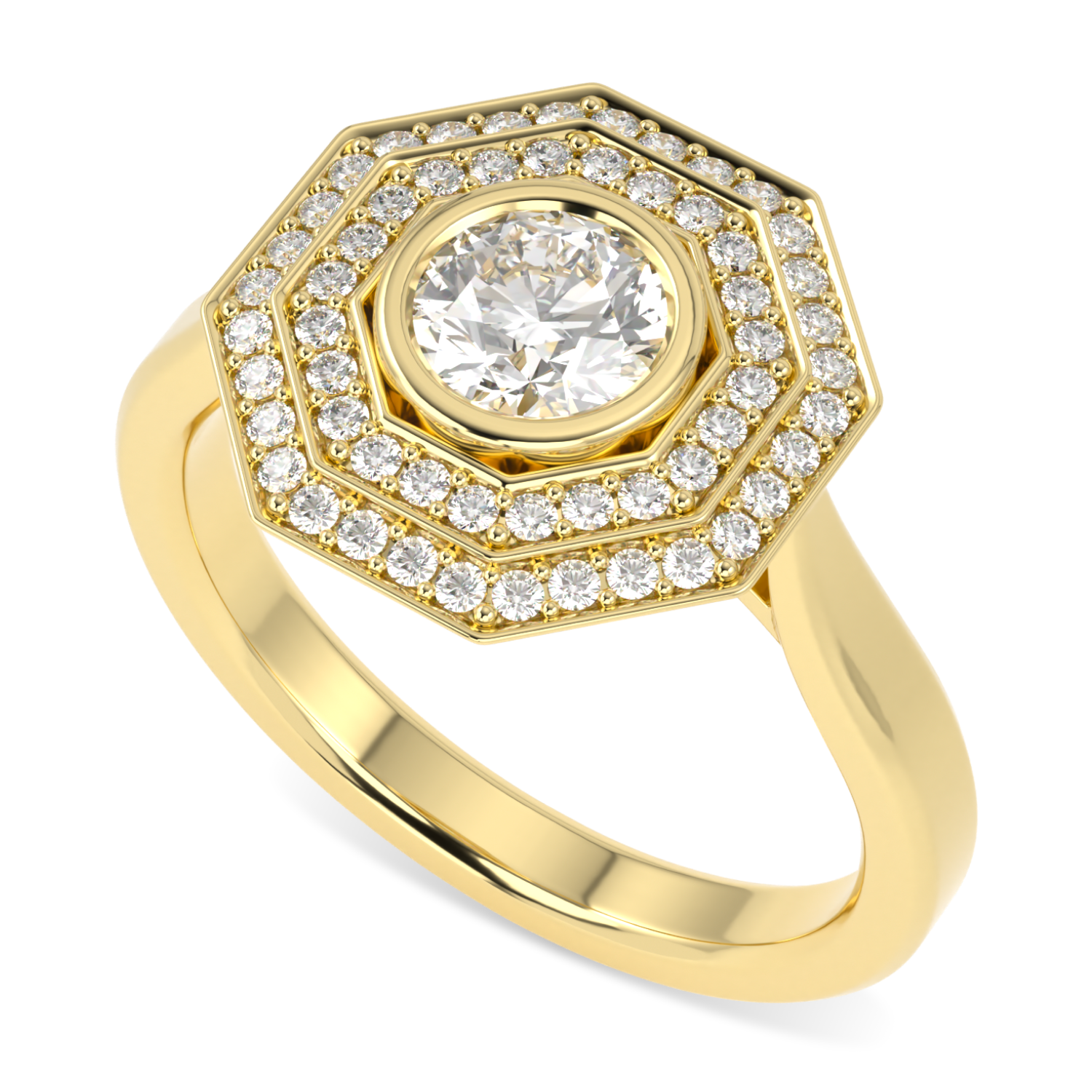 The Brilliance 40 double diamond octagonal halo offers a modern twist on a vintage style, enhancing the unique design with an additional halo of diamonds to stunning effect. All paying homage to the perfect alignment of facets within an exceptional round brilliant cut diamond. The rub over set central diamond sits proudly in the middle of 2 halos of pave diamonds. The central certificated 0.50cts round brilliant cut diamond is of G colour and VS1 clarity with EX/EX/EX cut grade. All on an 18ct yellow gold bevelled edged shank.