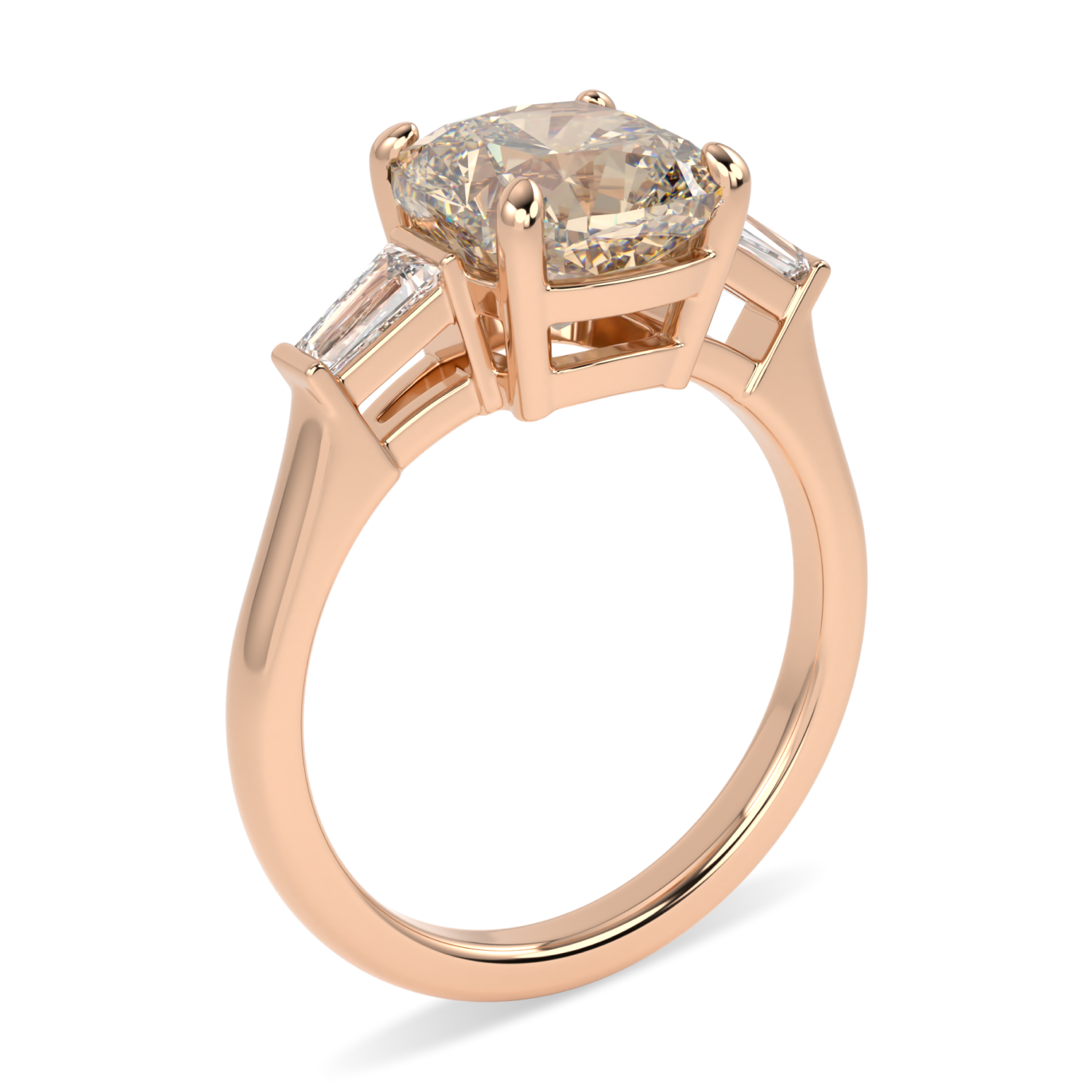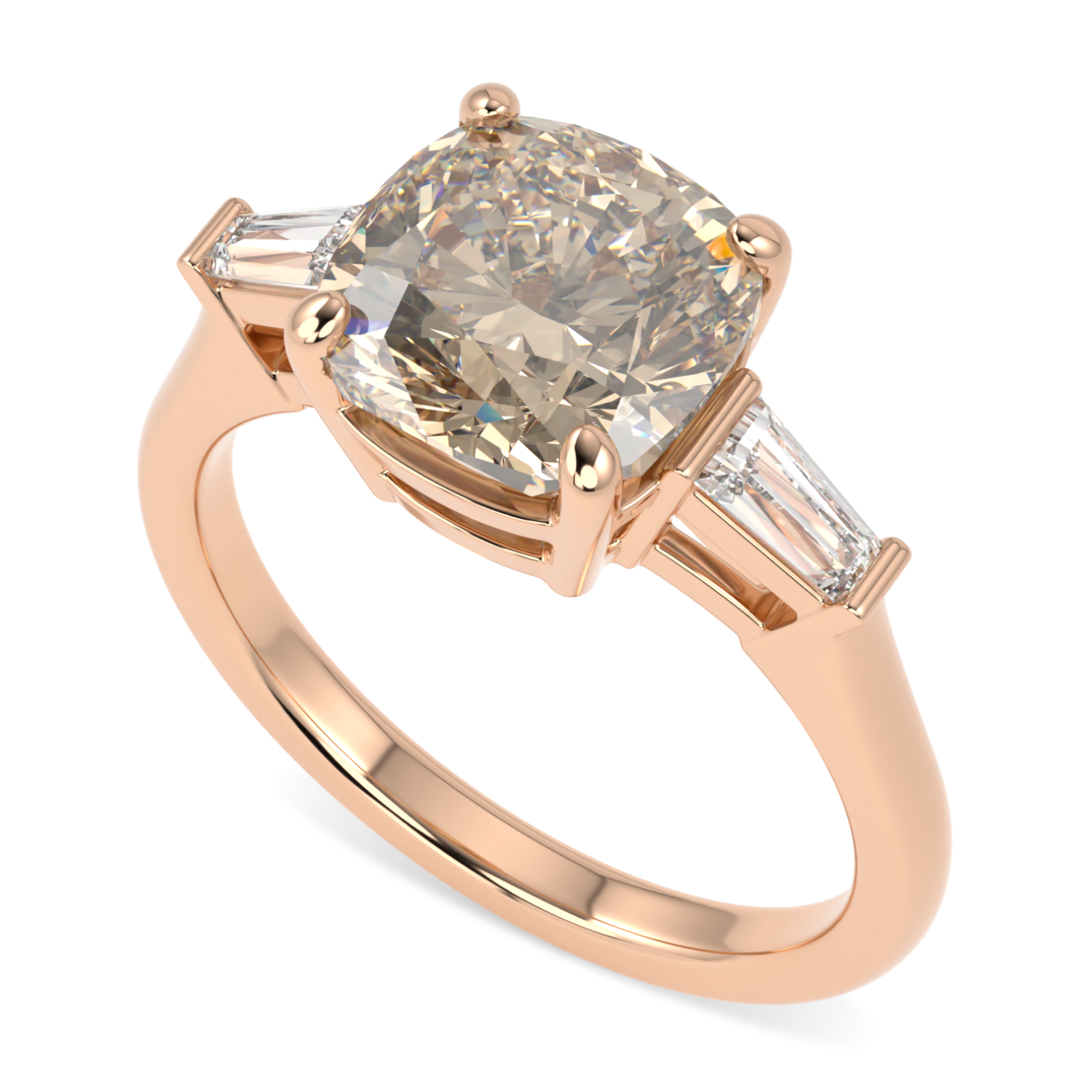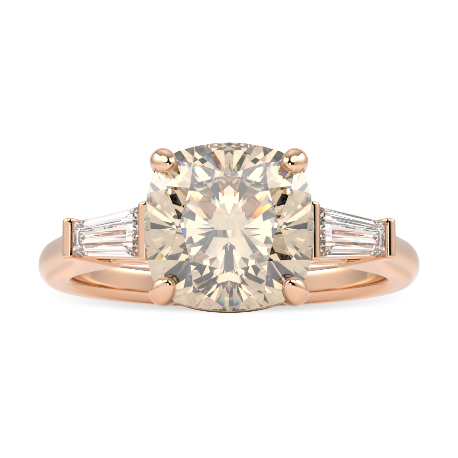 Contrasting the scintillation of a 3.01cts cushion cut Champagne diamond with the linear beauty of tapered baguette cut side stones is a statement of classic elegance. The perfectly positioned white side stones form defined lines that guide the light inwards, contrasting beautifully against the colour and the brilliance of the central Champagne diamond.