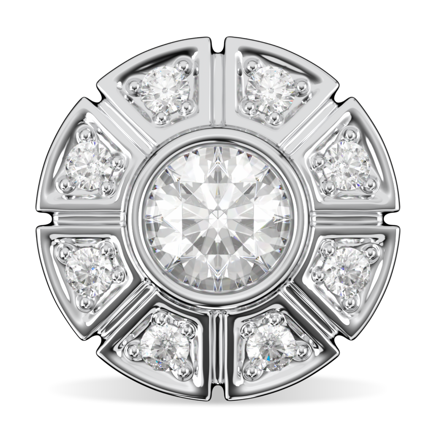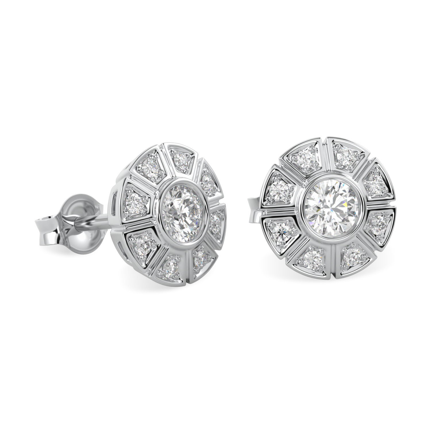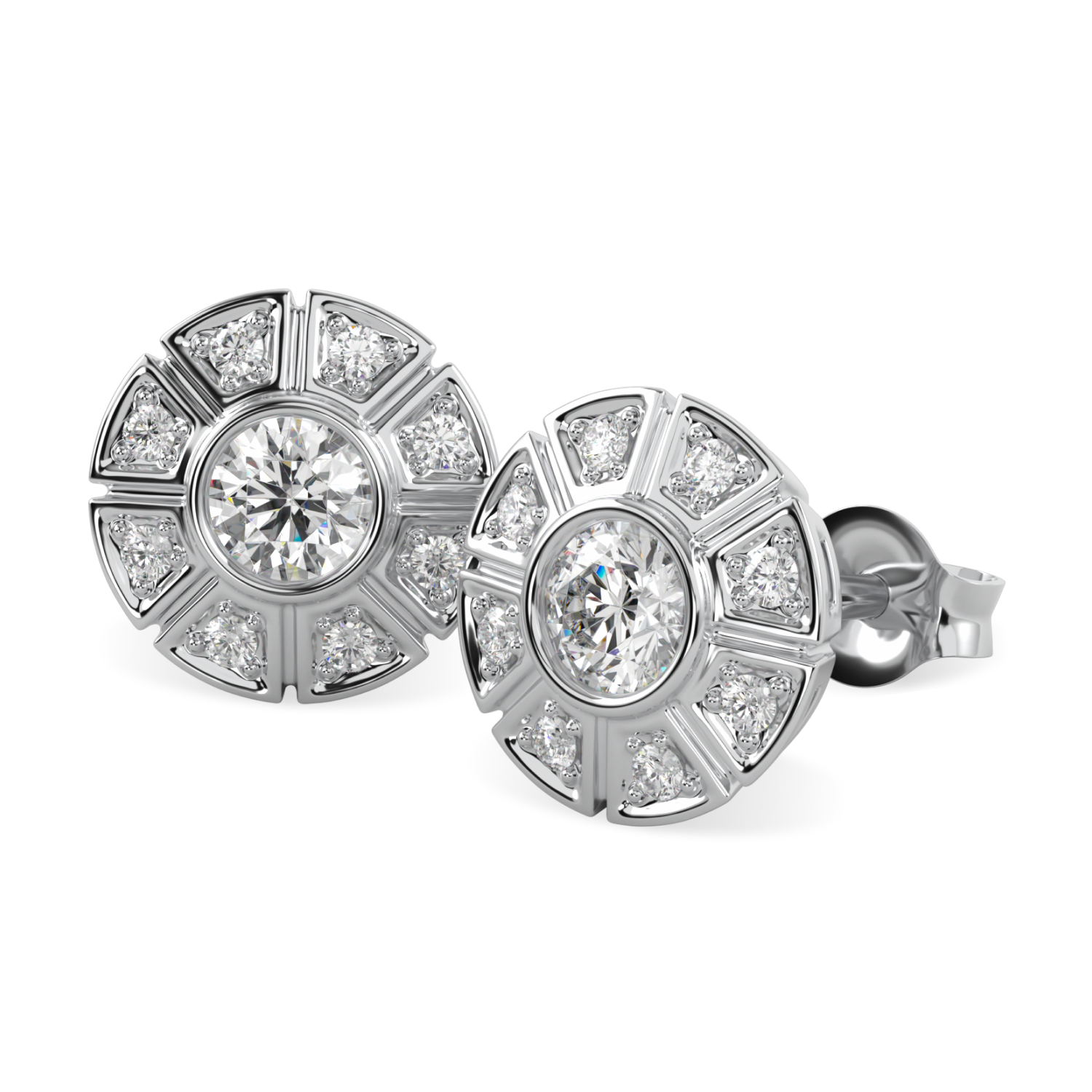 The Cipher earrings epitomize precision and elegance, featuring a 0.17cts round brilliant-cut diamond surrounded by 8 segments of sparkling diamonds. The design, with its geometric precision, fulfills a desire for order and harmony. All in 18ct white gold.