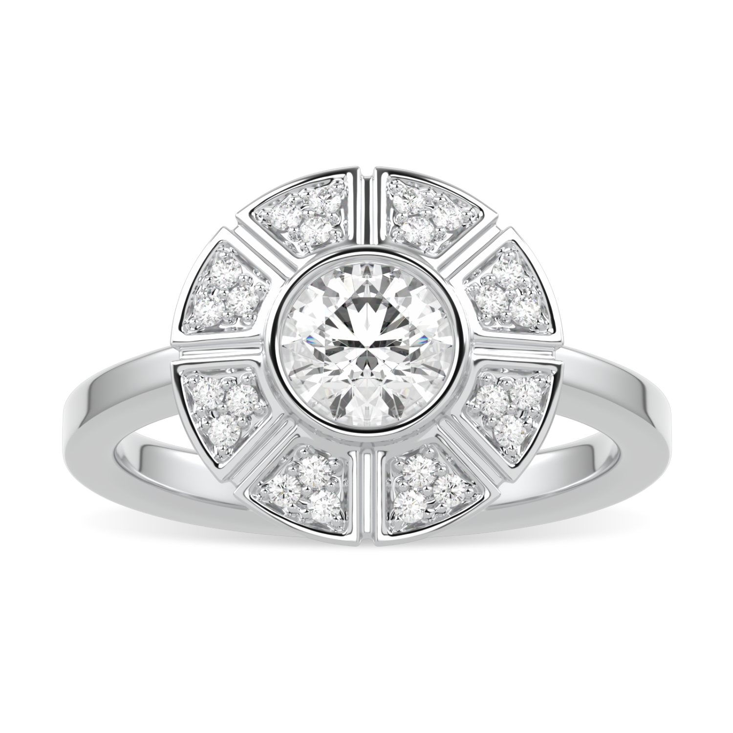 The Cipher ring mesmerises with a delightful and structured geometric design, showcasing a 0.50 carat round brilliant-cut diamond encircled by 8 segments of small diamonds. Resembling a code that elegantly and creatively resolves a challenge, the Cipher ring satisfies a desire for order and harmony. Approximate total carat weight of 0.62cts. The certificated central round brilliant cut is G colour, VS1 clarity. Crafted entirely in 18ct white gold.