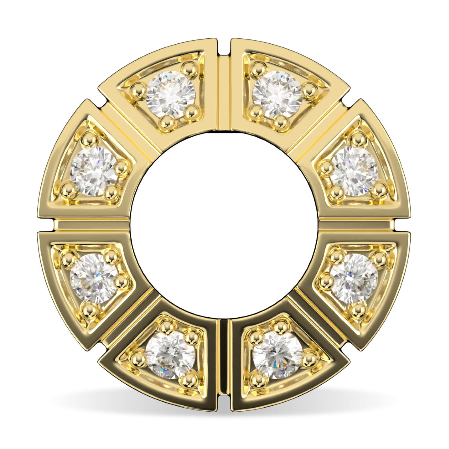 An 18ct yellow golden halo features 8 segments of sparkling diamonds. Precision geometric design. Elegant, flowing, and stunning.