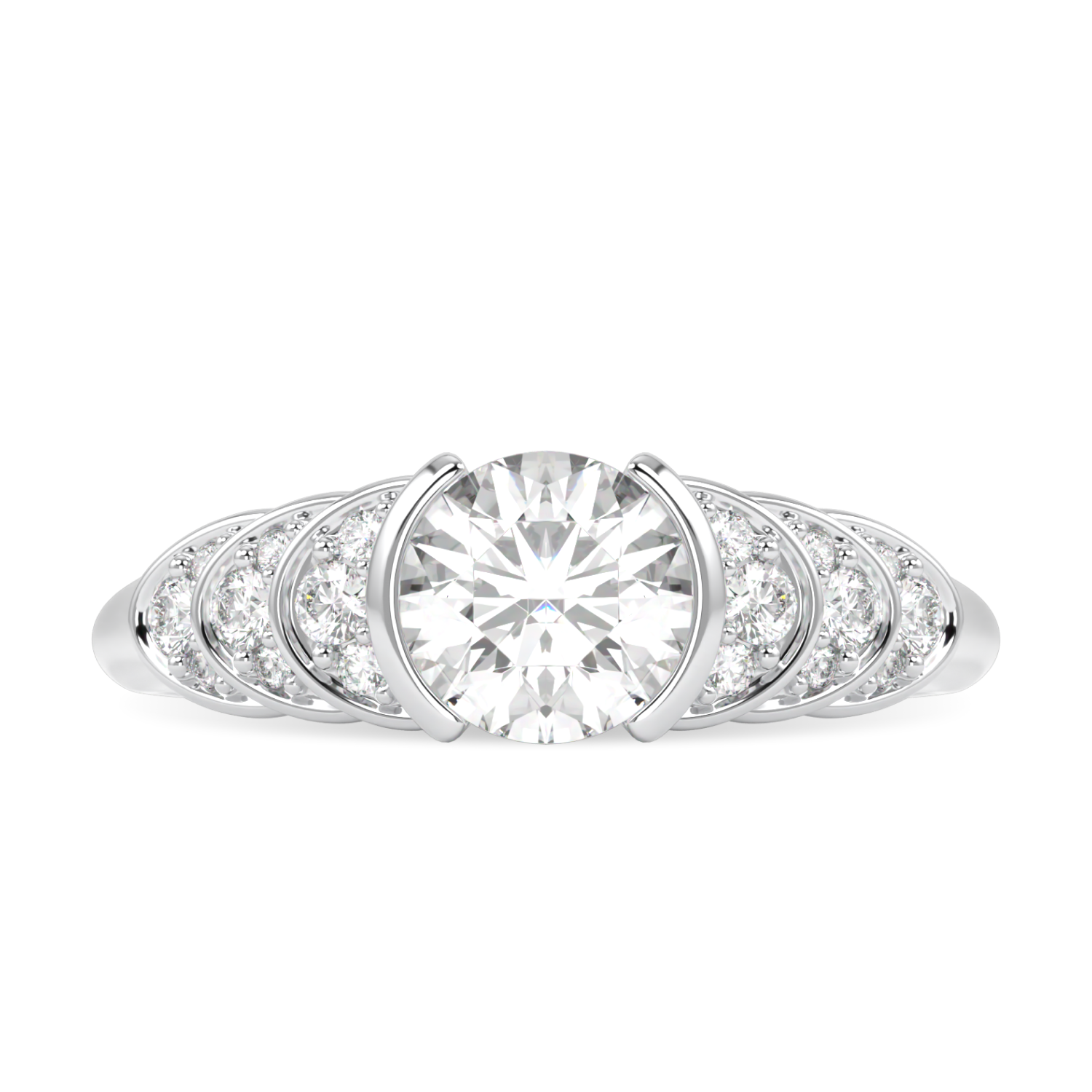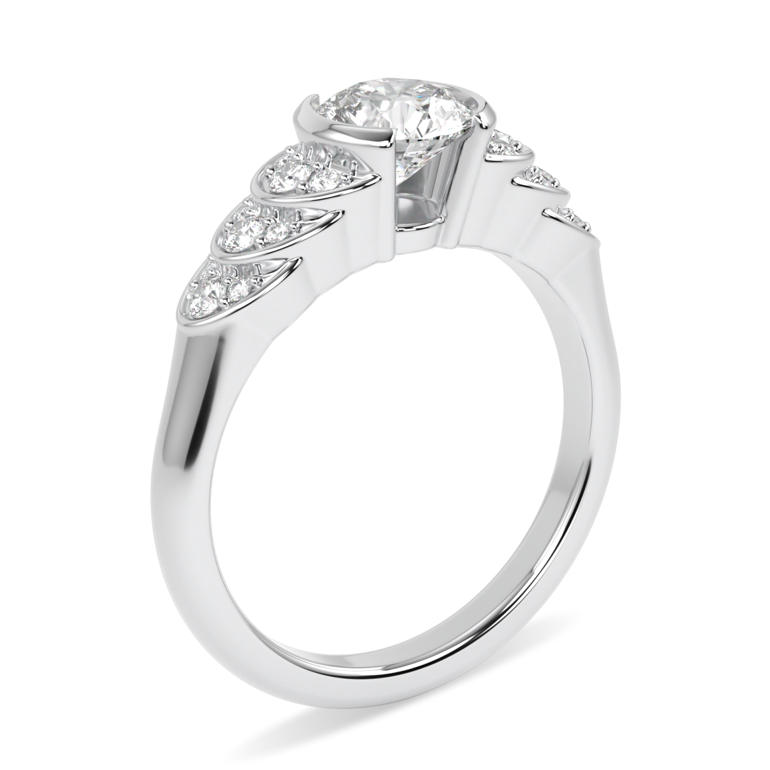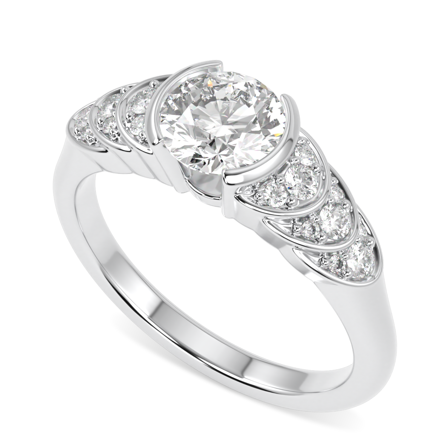 The bold Cove setting encapsulates nature's beauty at its finest. Drawing inspiration from our island heritage, where the sea shapes our identity, this piece mirrors the majestic coves sculpted by relentless waves. A 0.70cts round brilliant cut diamond is flanked by echoing half moons of diamonds on either side of the central stone. Set on a platinum shank