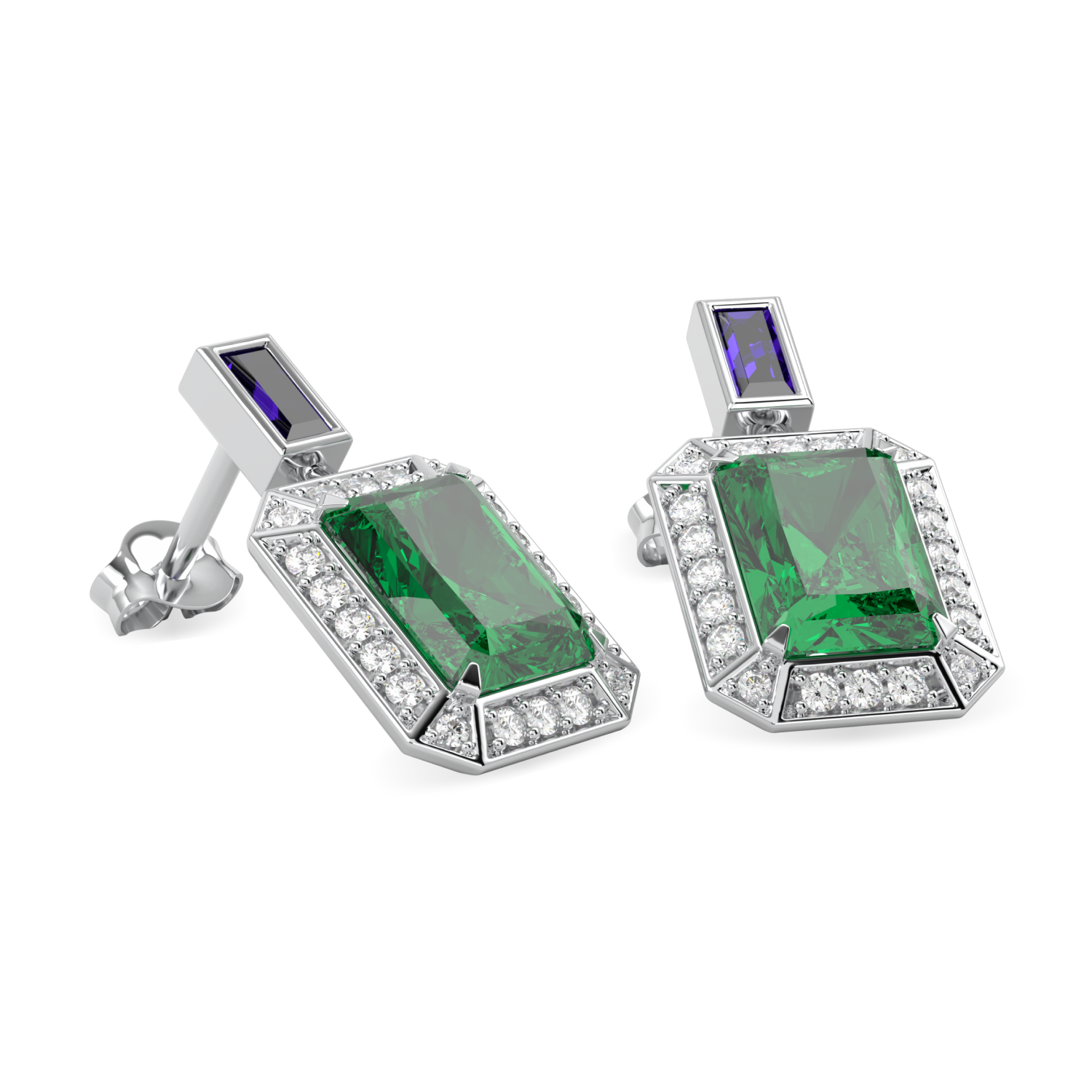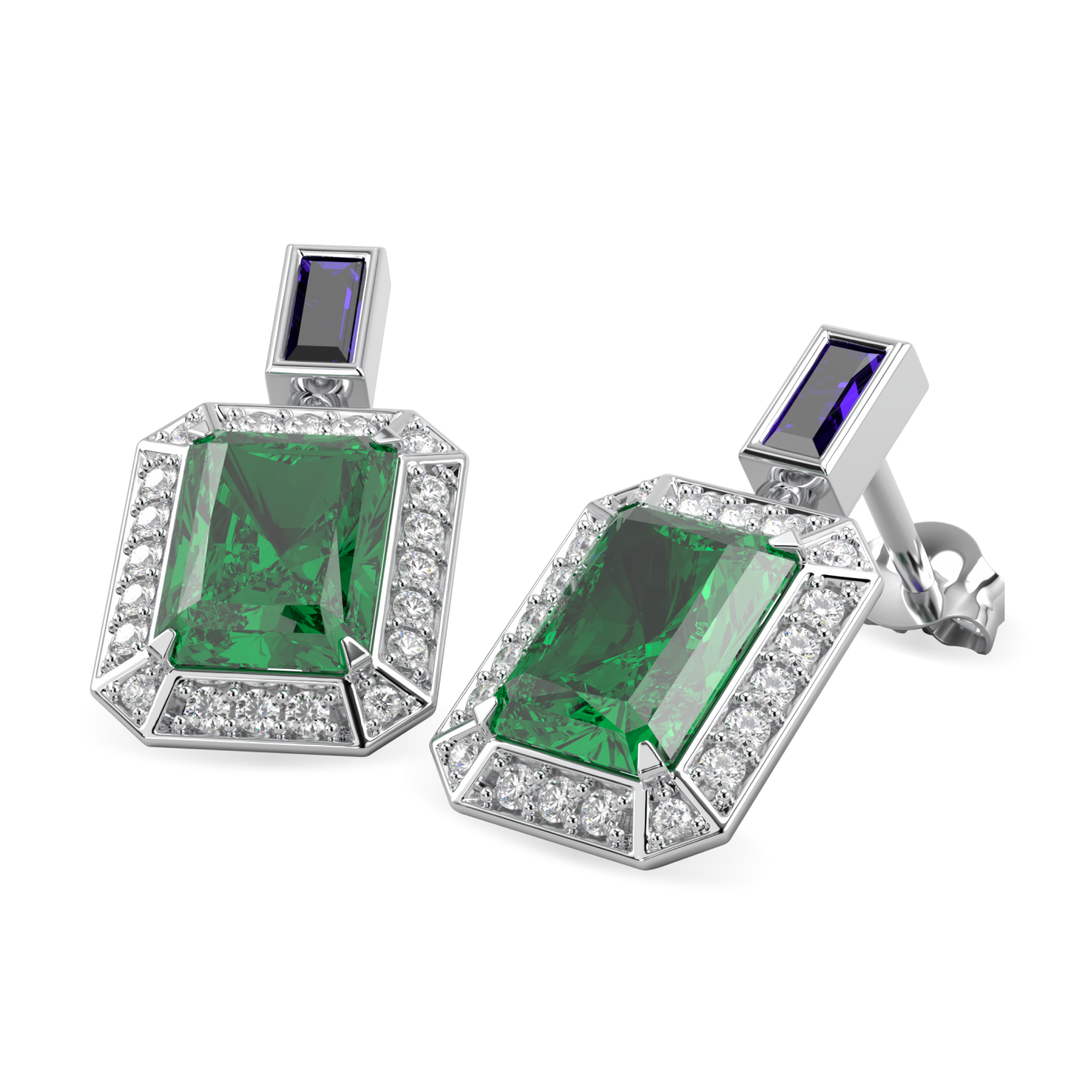 Colombian emeralds set in vintage diamond drops fall from baguette cut purple blue sapphires to beautiful and stunning affect. A statement pair of earrings set in 18ct white gold.