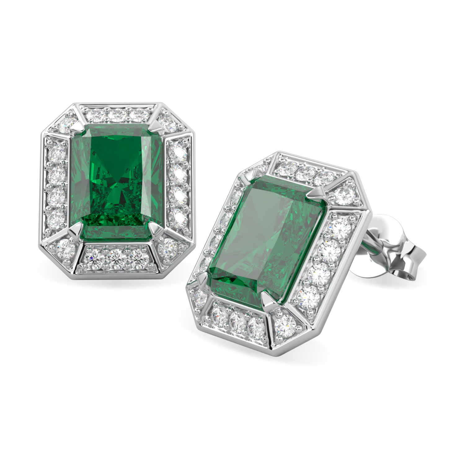 Vibrant green 1.00ct Colombian emeralds set in rectangular vintage style diamond set halos. An elegant statement pair of stud earrings all in 18ct white gold.