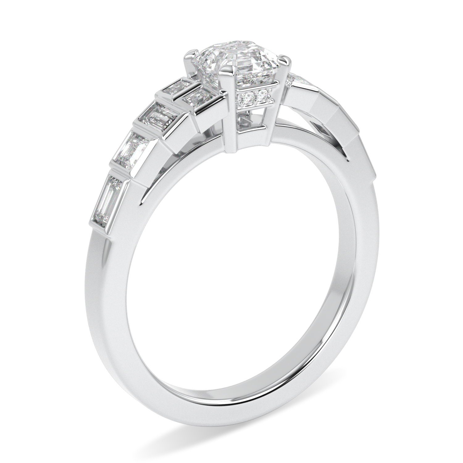 A cascade of diamonds reveals unparalleled elegance. Behold a 0.50cts certificated ascher cut diamond with precision-set baguette and square cut emerald cut diamonds gracing the shoulders and shank. A strong design capturing the inspiring beauty of the rock formations and crags that define the English Lake District. Set on a platinum shank