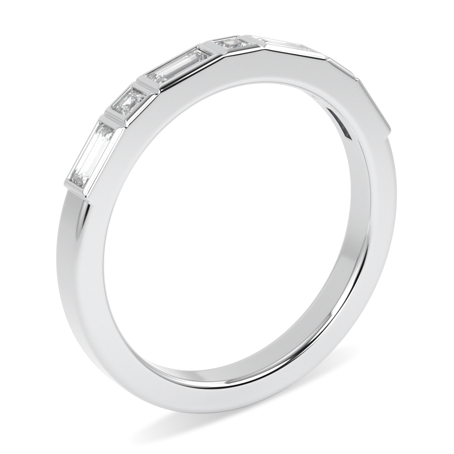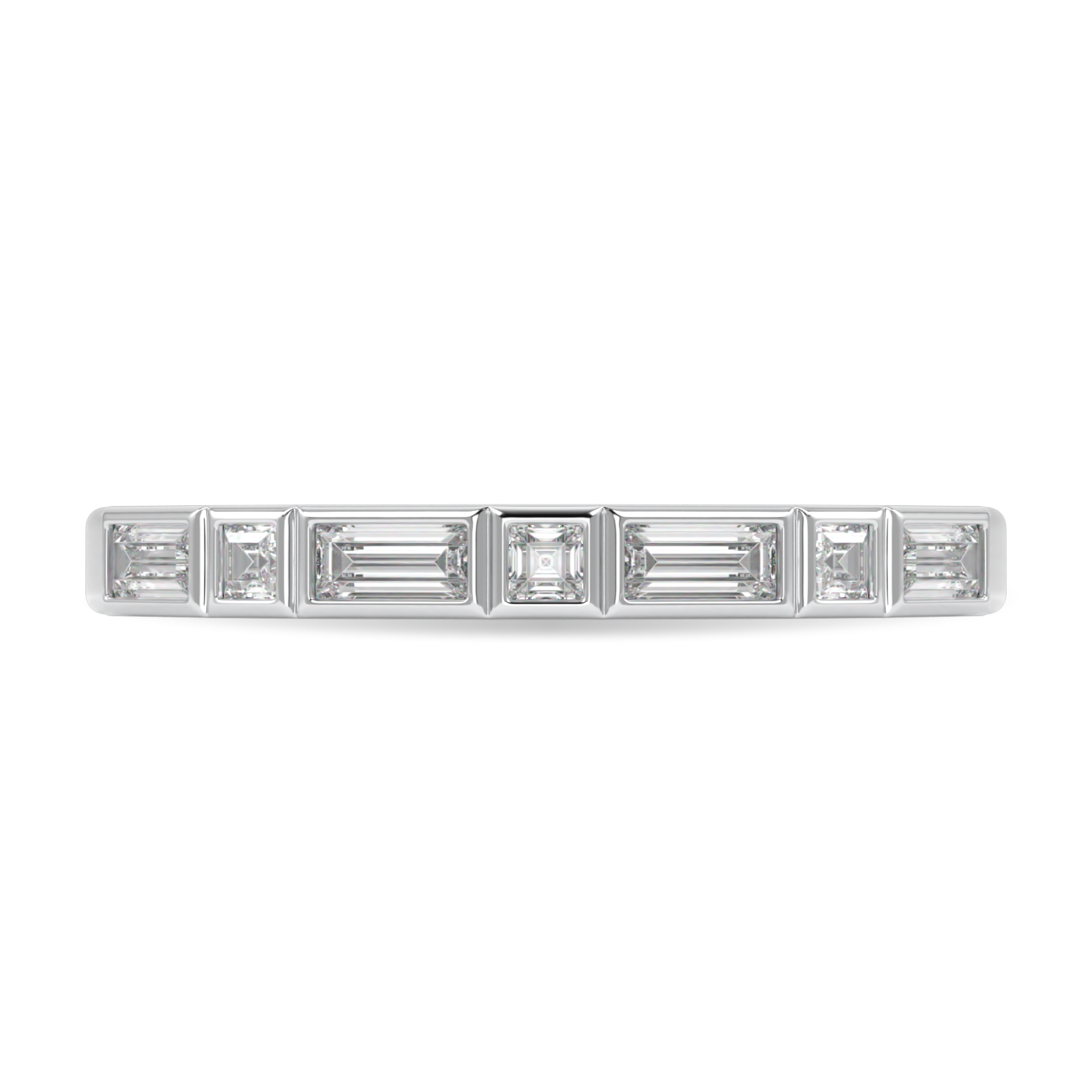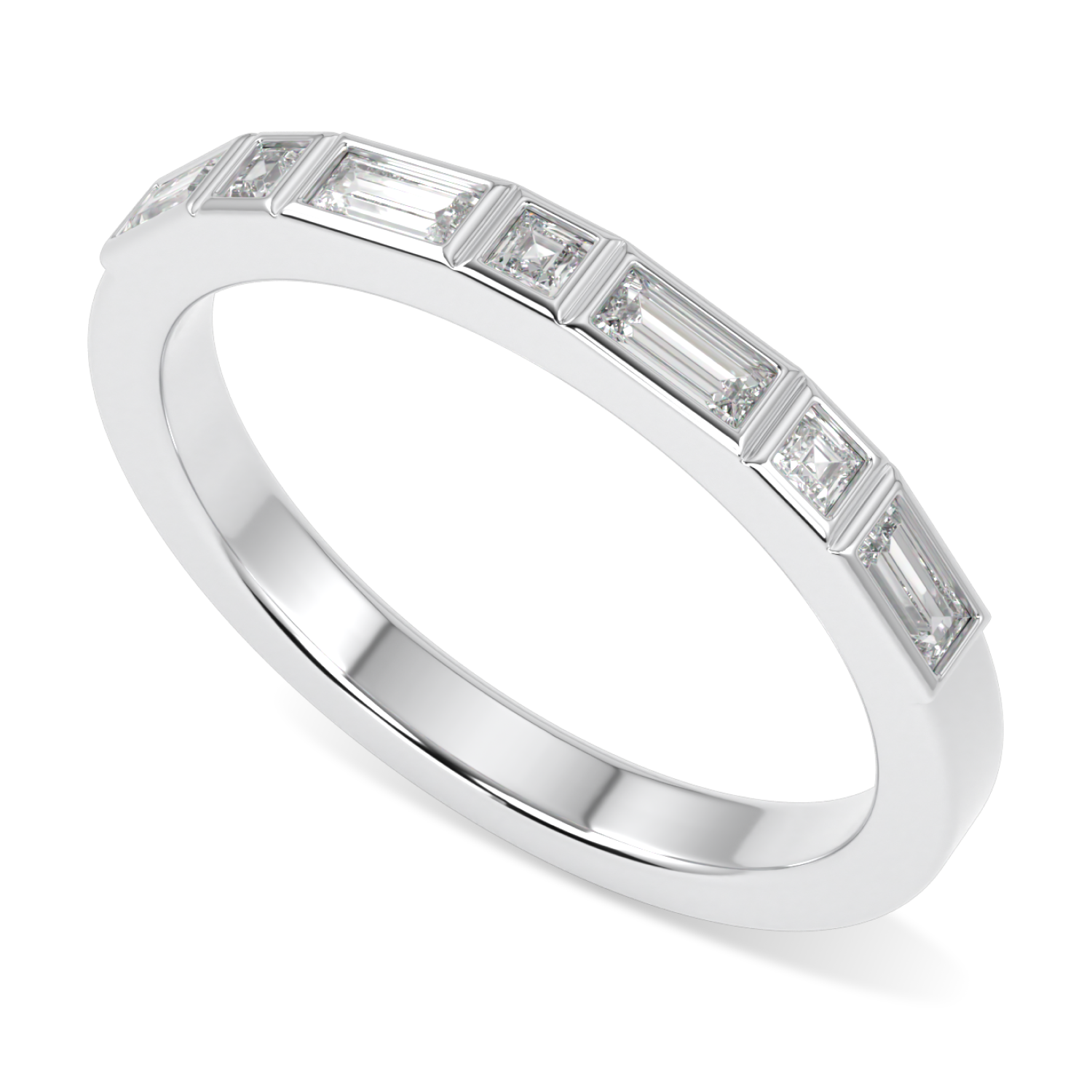A Flat Court shaped band designed to sit flush against your engagement ring. Precision set with alternating baguette cut diamonds and princess cut diamonds. Total carat weight 0.285cts. This platinum band has been designed to elegantly compliment any chosen style and design or can work as a stand alone ring.
