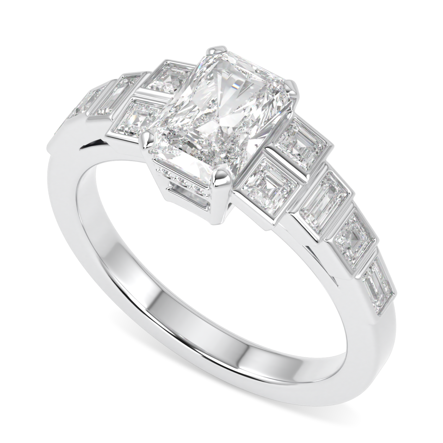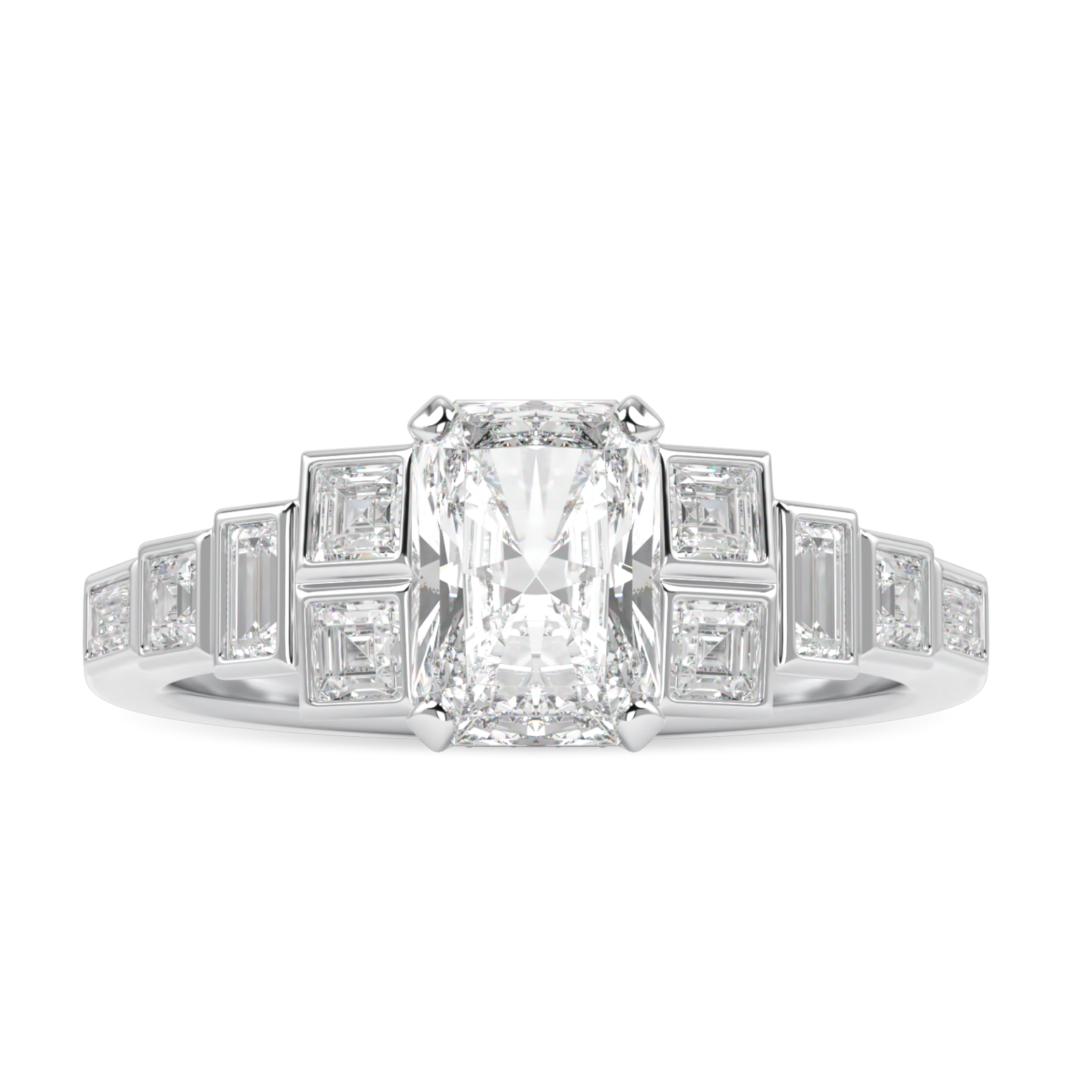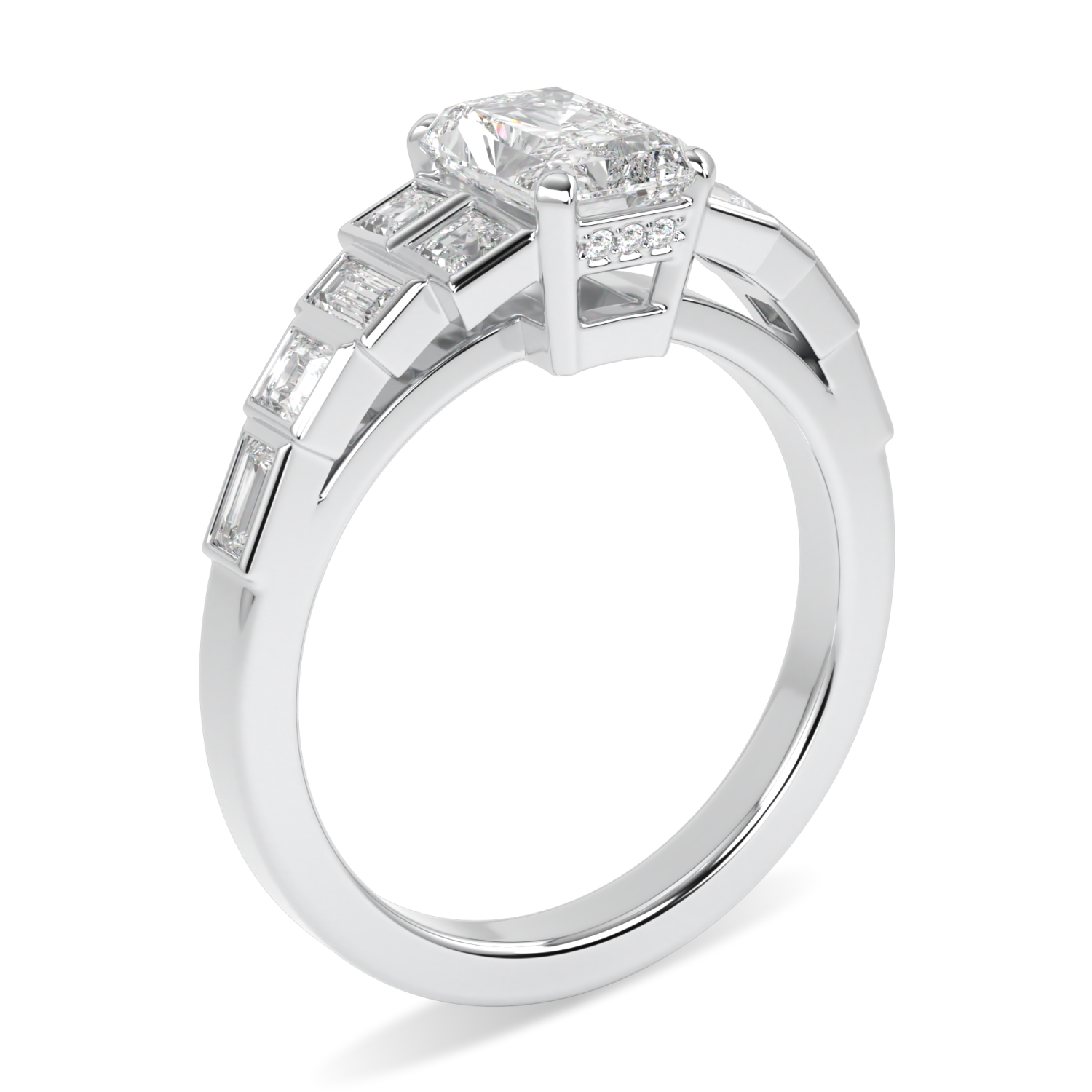 A cascade of diamonds reveals unparalleled elegance. Revealing a certificated 1.02cts radiant cut diamond, adorned with precision-set baguette and square emerald cut diamonds gracing the shoulders and shank. A striking design inspired by the majestic beauty of the rock formations and crags found in the English Lake District. The central certificated 1.02cts radiant cut diamond is G colour with VS1 clarity. Set on a platinum shank