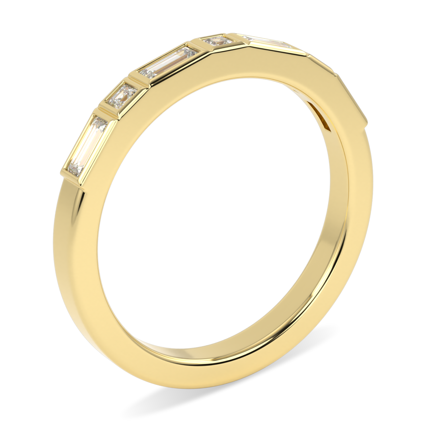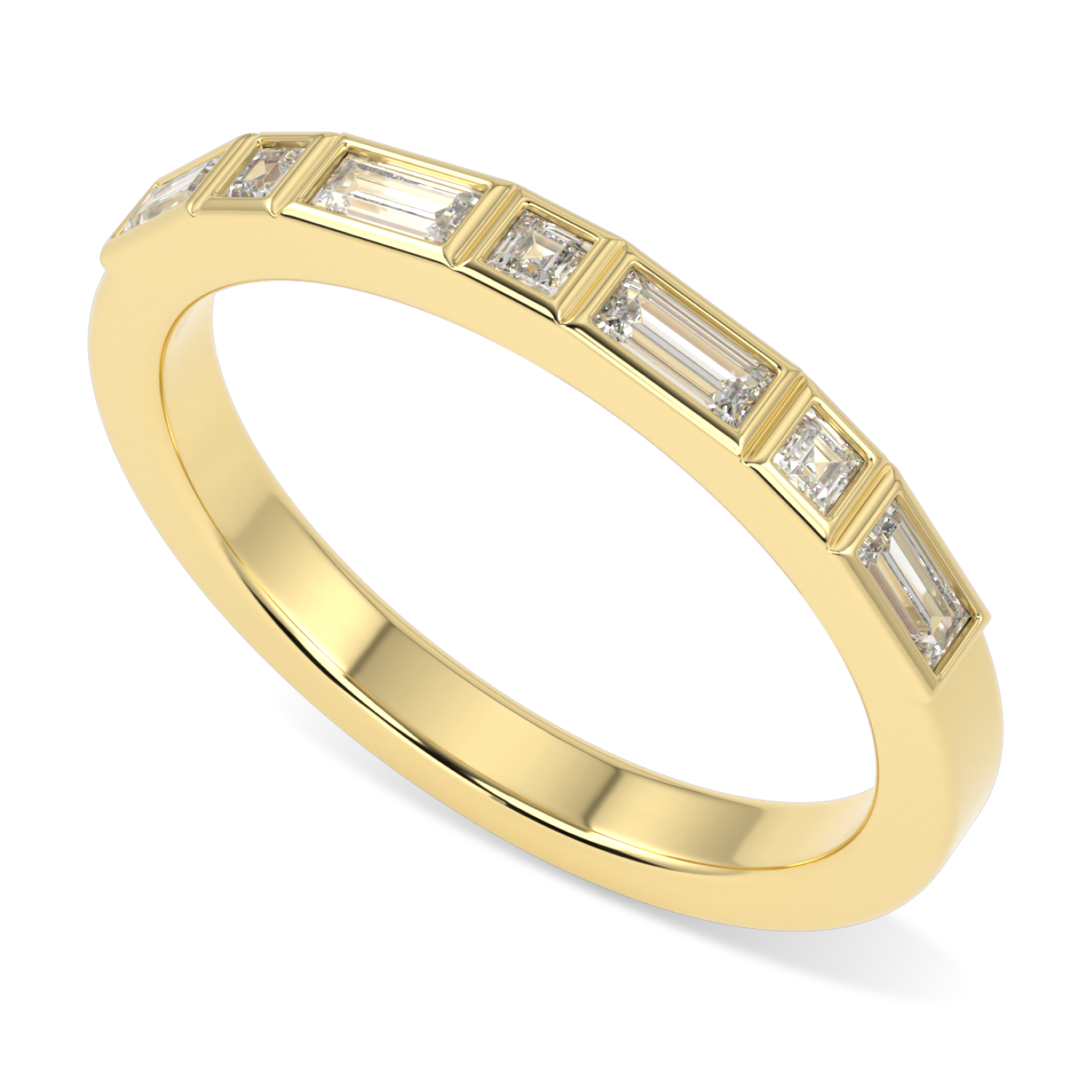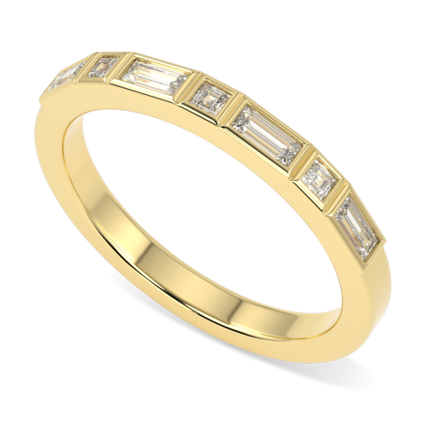A Flat Court shaped band designed to sit flush against your engagement ring. Invisibly set with elegant alternating baguette cut diamonds and princess cut diamonds. Total carat weight 0.285cts. This 18ct yellow gold band has been designed to elegantly compliment any chosen style and design or can work as a stand alone ring.