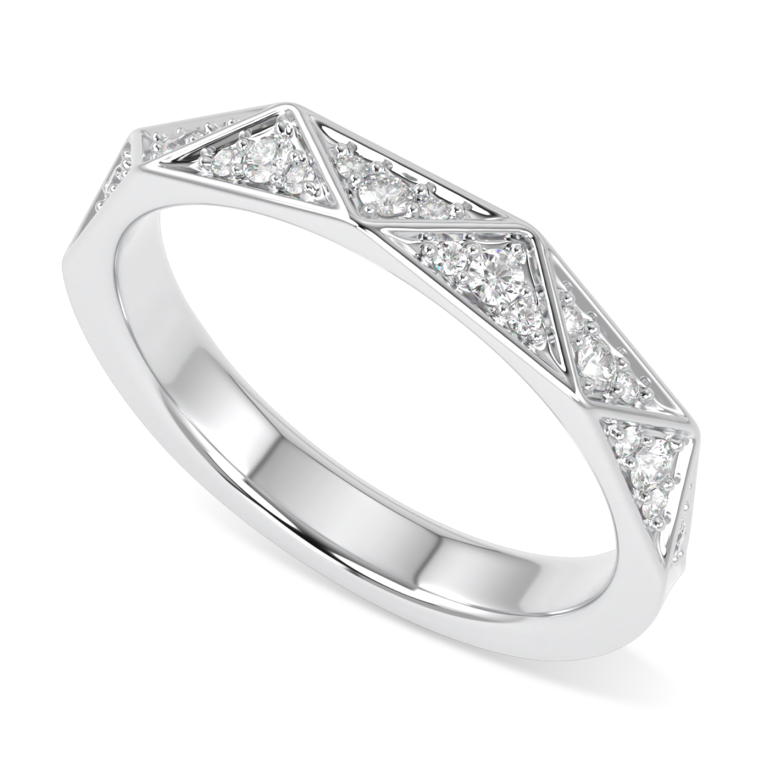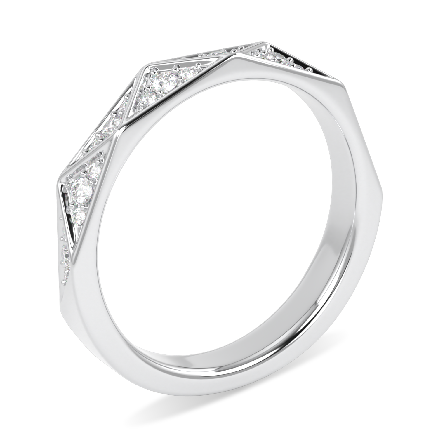 Crafted from platinum, our elegant 3mm Blacklock Hawthorn ring is adorned with pavé diamonds, each stone micro set. The ring's angular silhouette and crisscross diamond precious metal segments offers a striking interpretation of beautiful wild Hawthorn hedgerows. A unisex ring that can be worn alone or with an engagement ring.