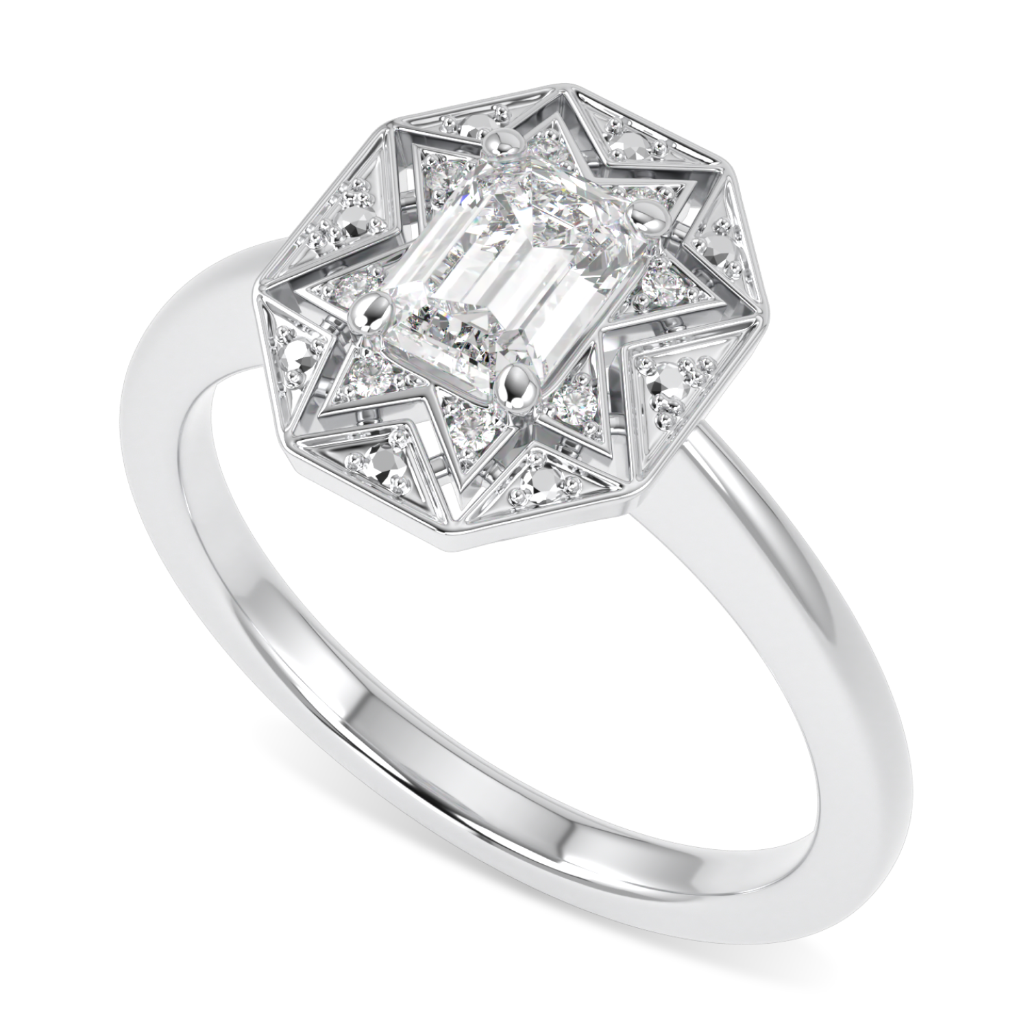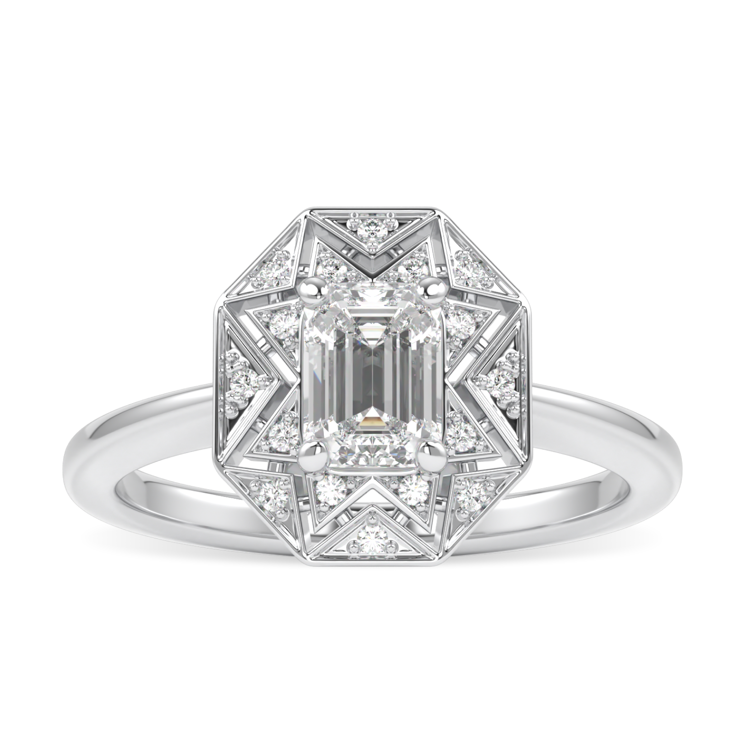 The enchanting Hawthorn platinum ring showcases the beauty of nature, featuring diamond pavé within an octagonal halo inspired by the splendid hedgerows of the English countryside. A 0.50cts emerald cut diamond is surrounded by a cluster and halo of white diamonds. Set on a platinum shank