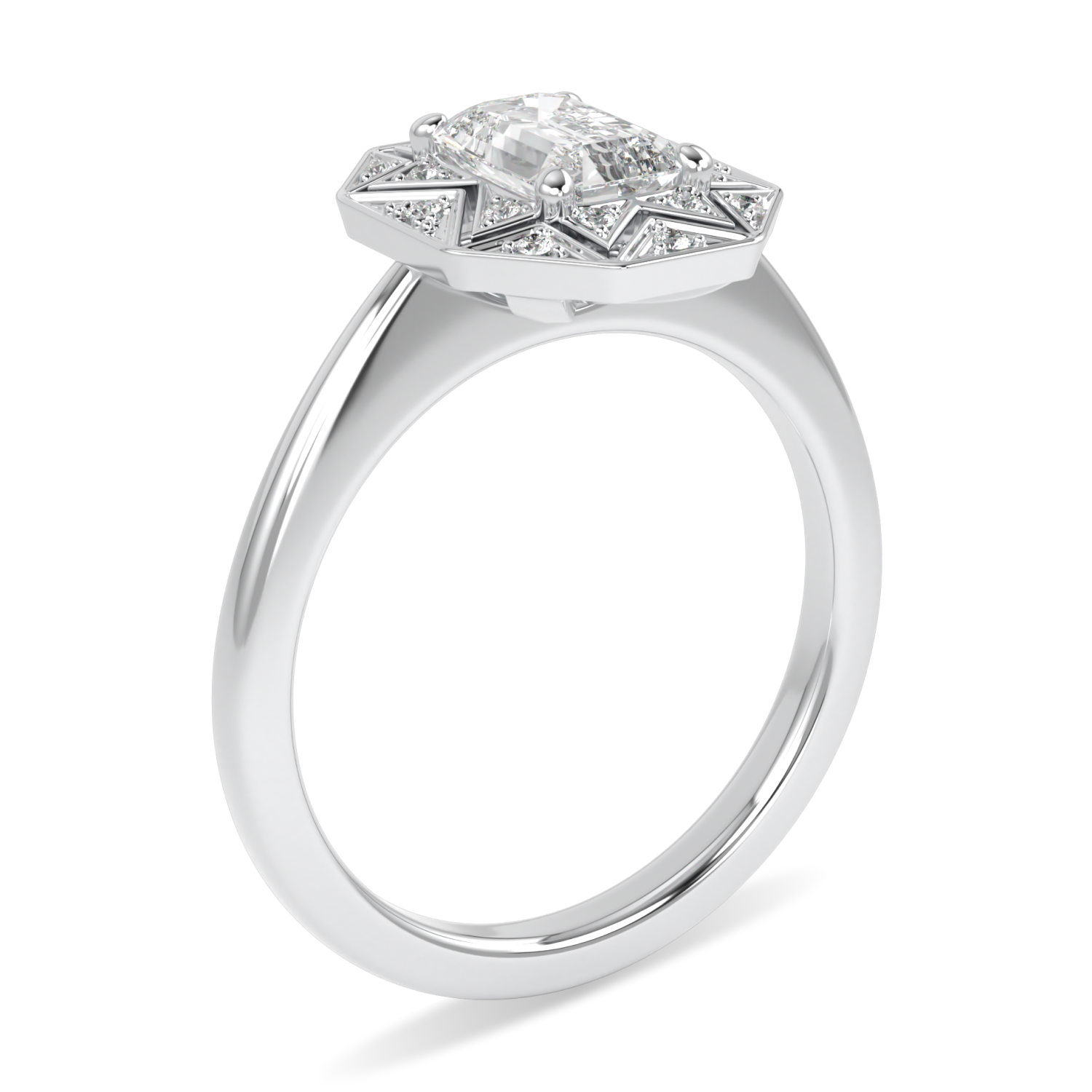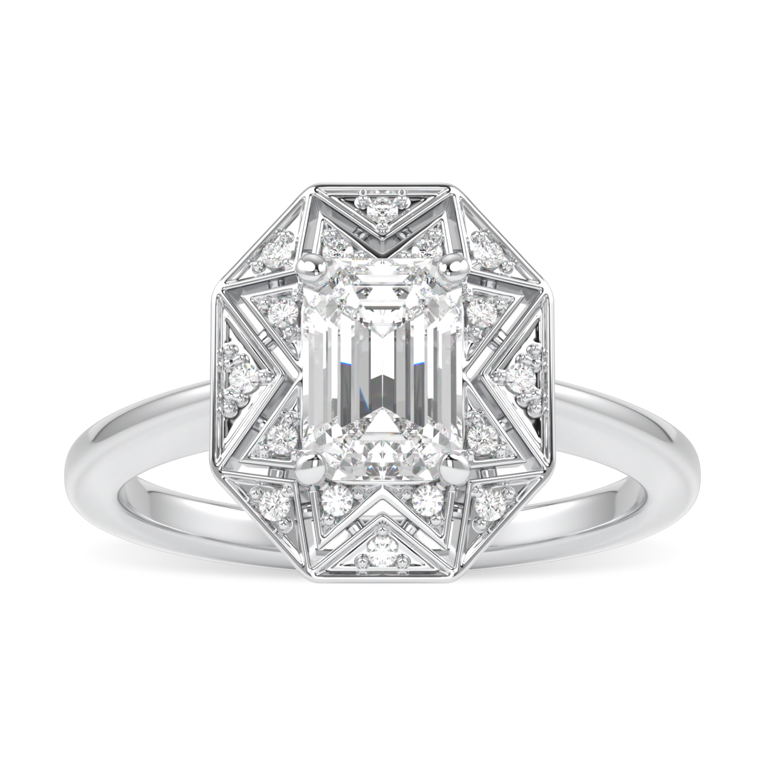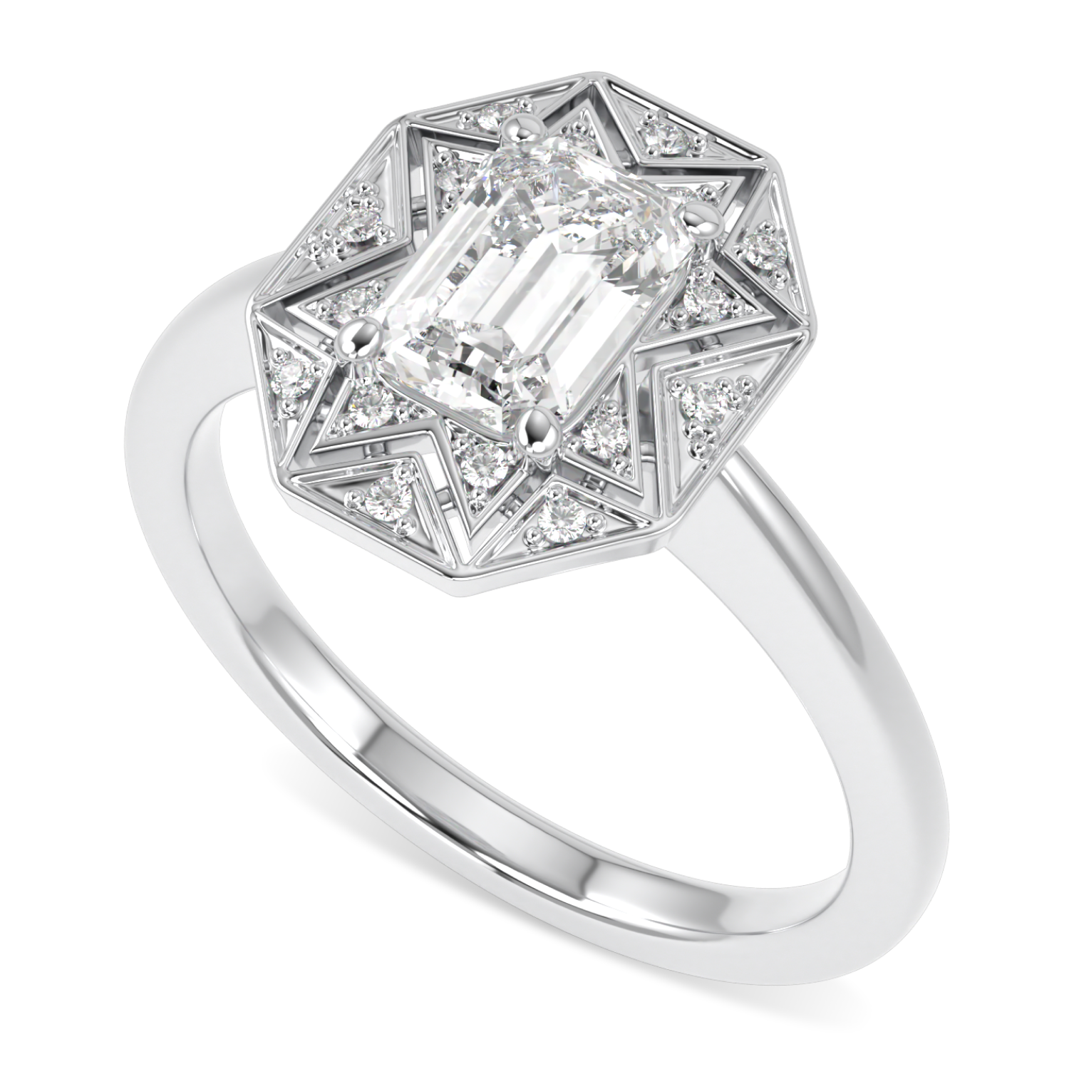 The captivating Hawthorn Platinum Ring celebrates the allure of nature, adorned with diamond pavé within an octagonal halo inspired by the rugged beauty of rural English hedgerows. A 0.80cts emerald cut diamond is surrounded by an octagonal halo of white diamonds. Set on a platinum shank with platinum head