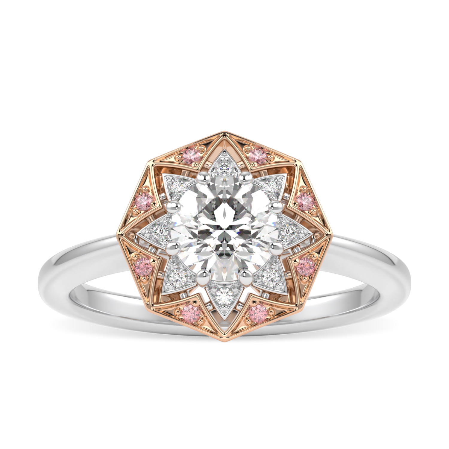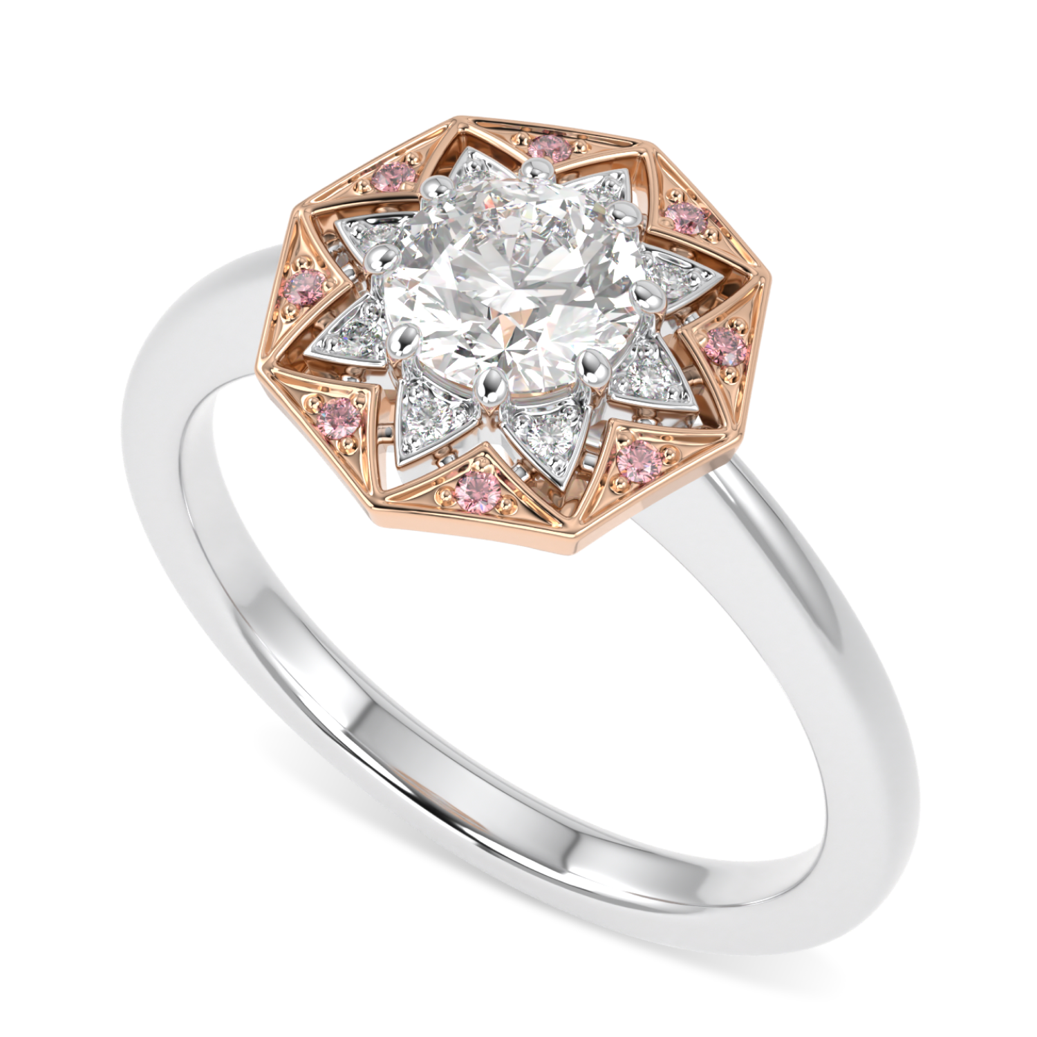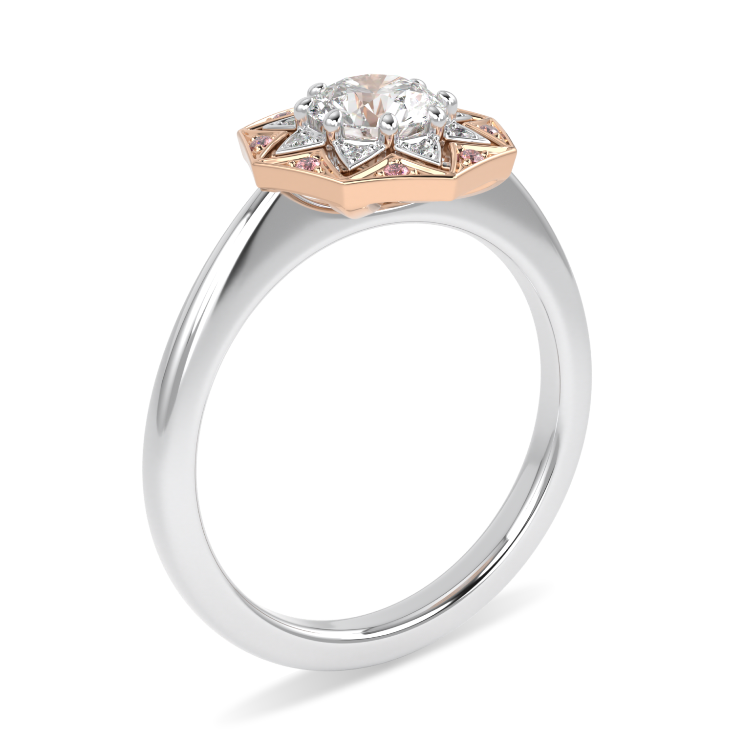 The Hawthorn engagement ring collection honors the rugged beauty of the hedgerows of rural England. An exquisitely striking fusion of white and pink diamonds encircles a round brilliant cut diamond within an outline octagonal halo. A 0.50cts round brilliant cut diamond is encircled by a clustered halo of white and pink diamonds. Set on a platinum shank with platinum and 18ct rose gold head.