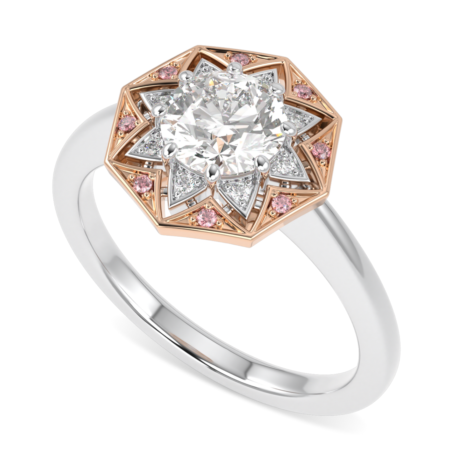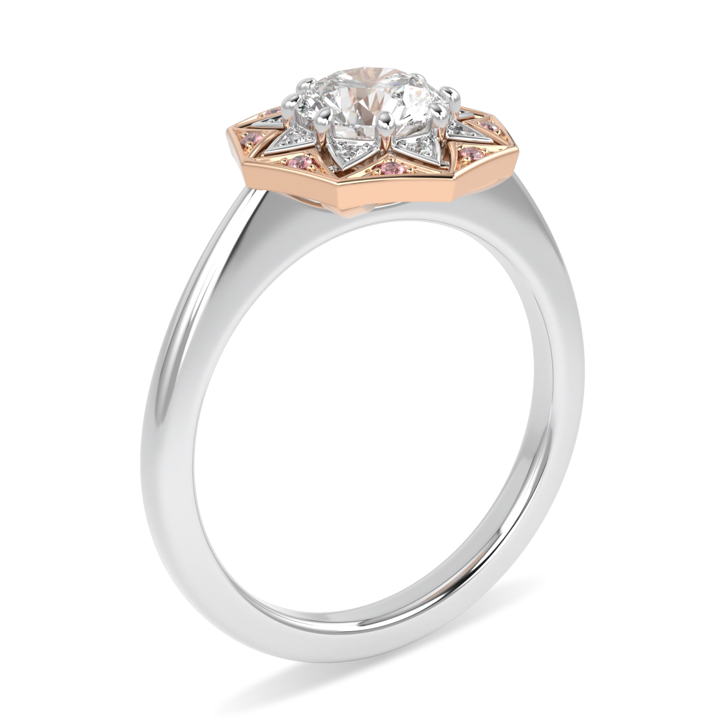 The Hawthorn engagement ring pays homage to the rugged charm and beauty of England's countryside hedgerows. It features a stunning combination of white and pink diamonds encircling a round brilliant-cut diamond within an outline octagonal halo. A 0.70cts round brilliant cut diamond is encircled by a clustered halo of white and pink diamonds. Set on a platinum shank with platinum and 18ct rose gold head.
