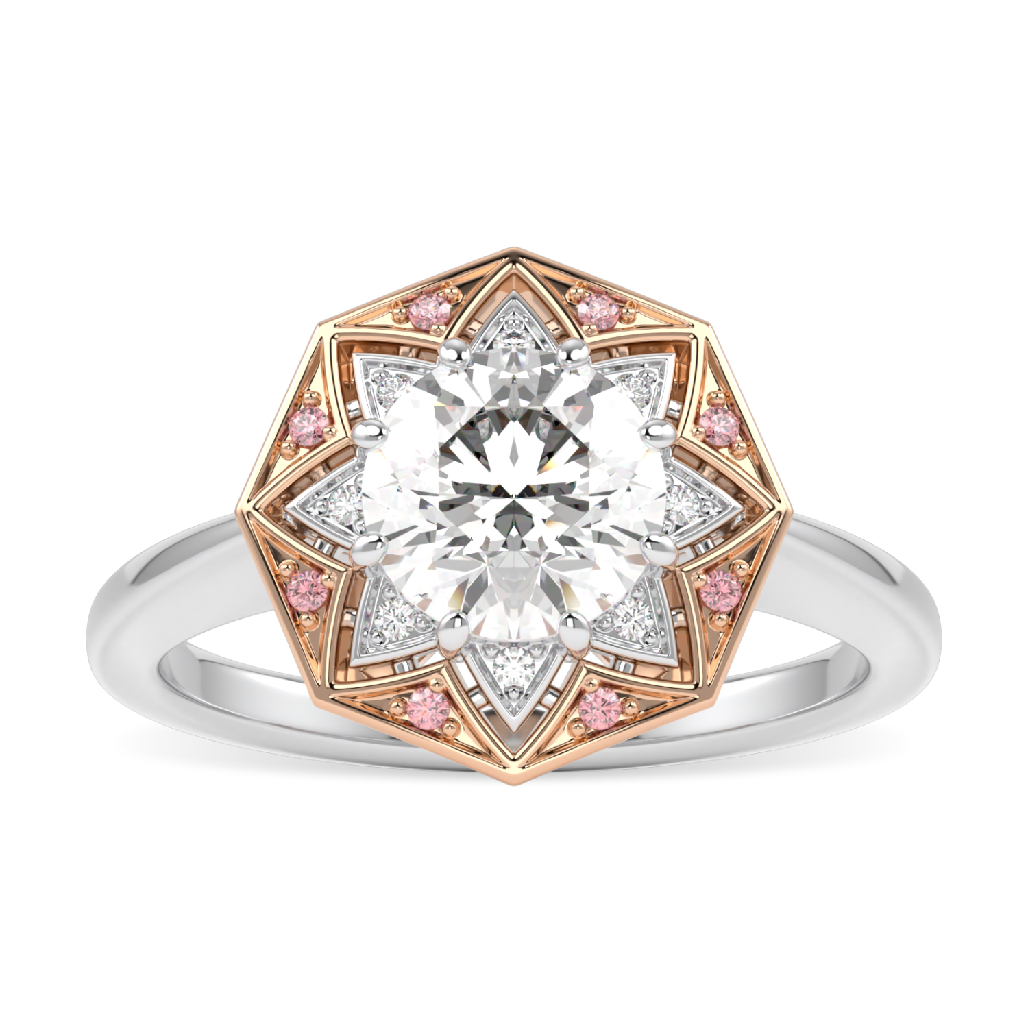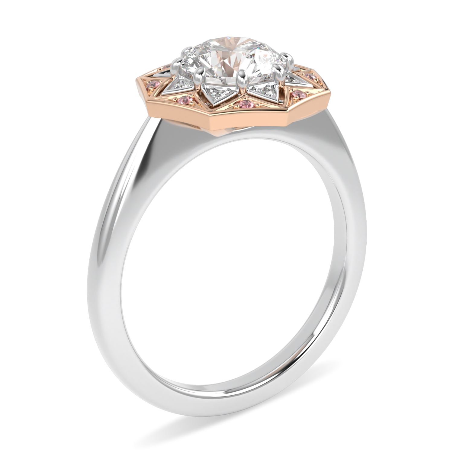 The Hawthorn engagement ring honors the rustic majestic beauty of headgerows of rural England through the seasons. It showcases a striking blend of white and pink diamonds encircling a round brilliant-cut diamond within an octagonal halo. A 1.00cts round brilliant cut diamond is encircled by a clustered halo of white and pink diamonds. Set on a platinum shank with platinum and 18ct rose gold head