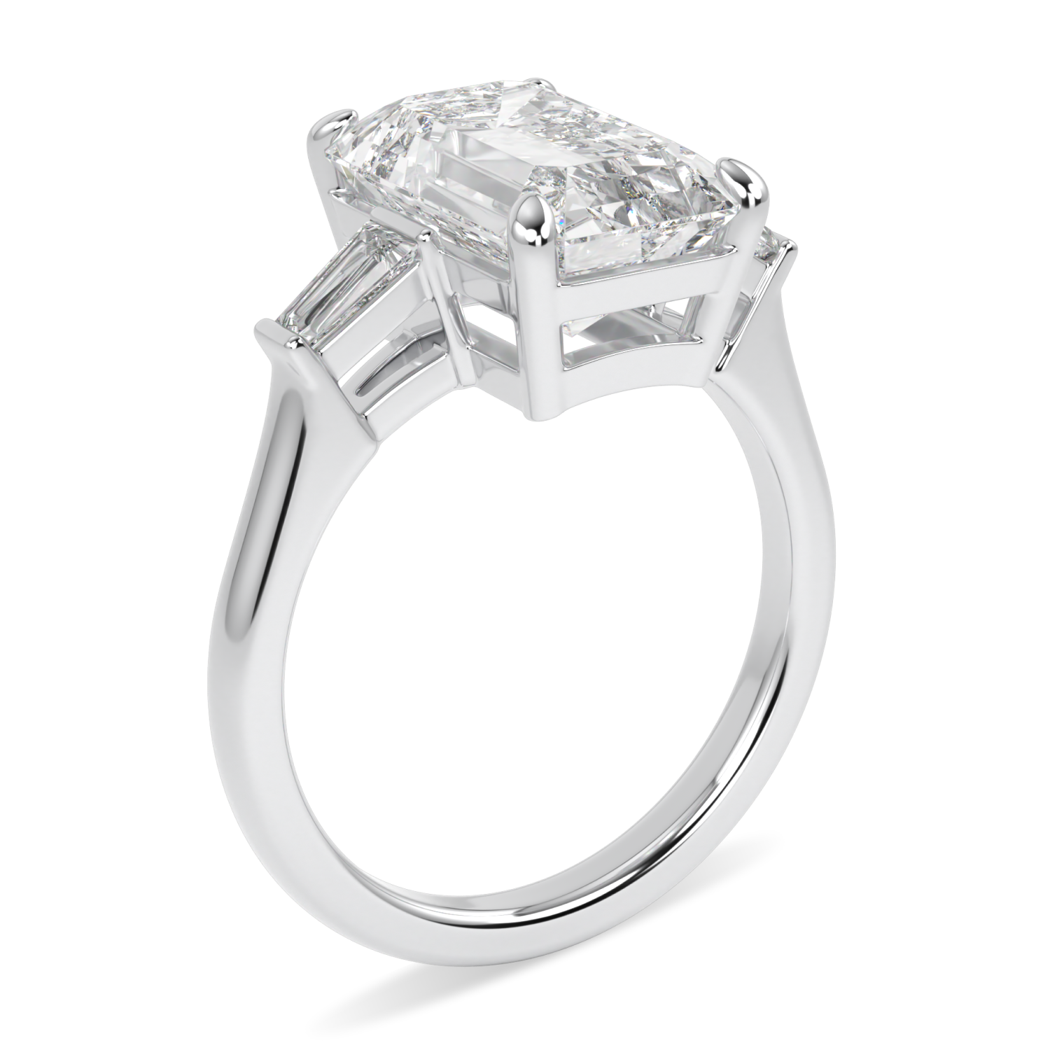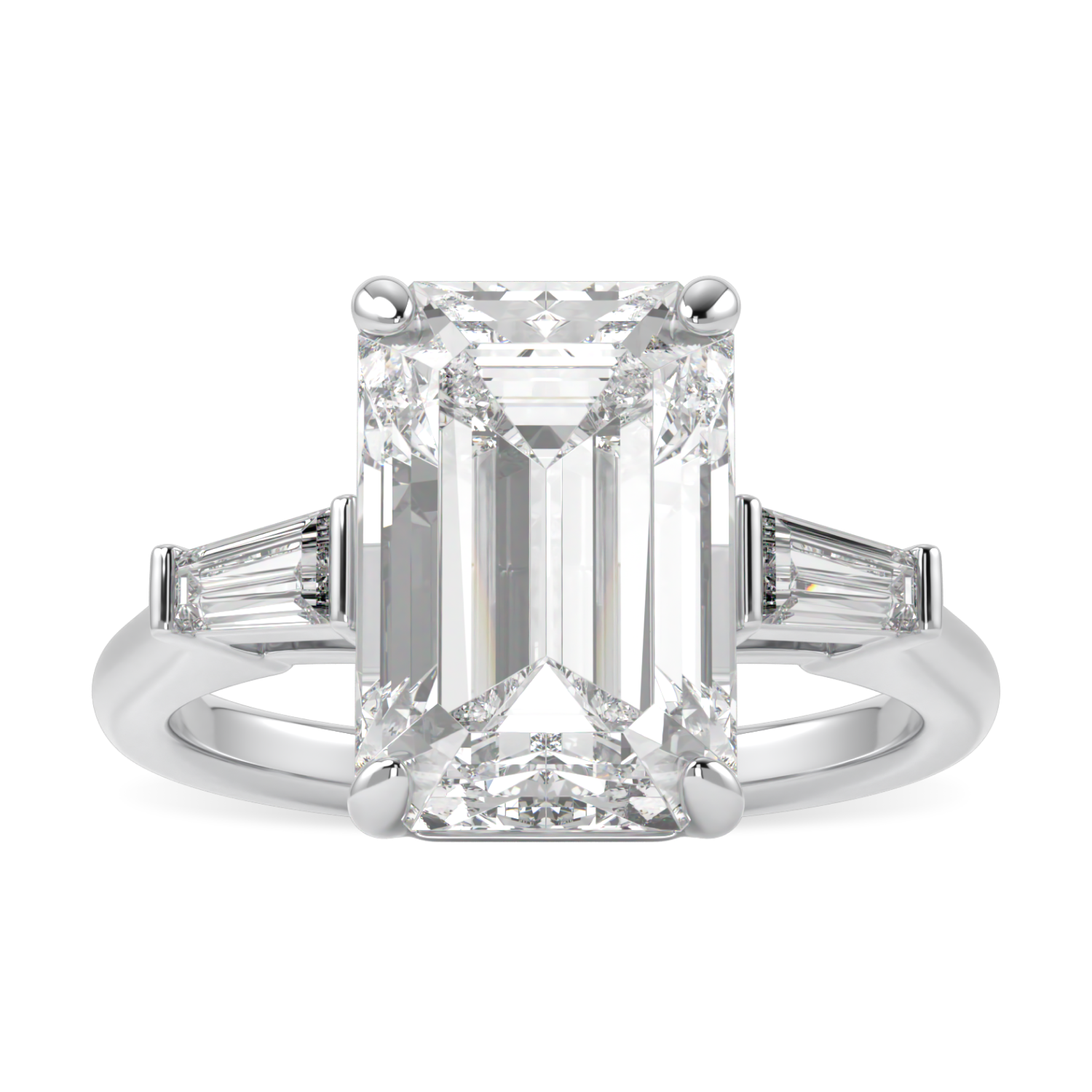 The precise placement of tapered baguette shoulder stones accentuates the central diamond in this three-stone engagement ring whilst the sleek platinum shank enhances the linear elegance of the emerald cut diamond, beautifully flanked by tapered baguette side stones. The creation of this extraordinary piece requires meticulous consideration of every detail. The design has been rigorously examined to ensure perfect balance, with every angle and claw precisely positioned. The height of the head is carefully calibrated to be neither too high nor too low, and the width of the shank has been modeled multiple times to achieve flawless proportions. All stones are matching and have been carefully hand selected by Chris Blacklock.