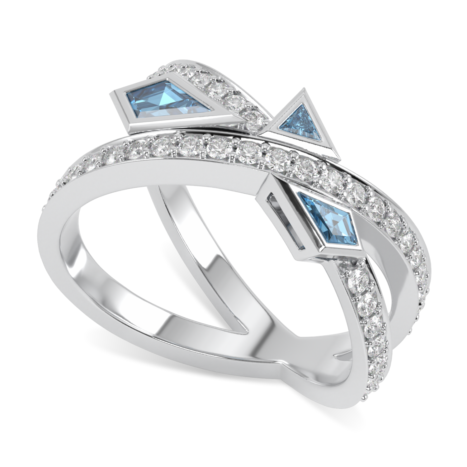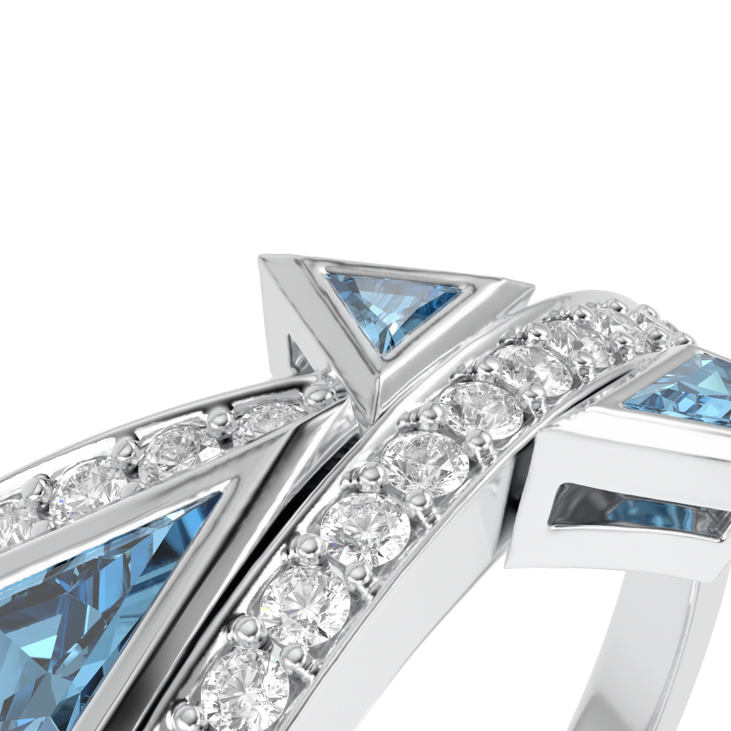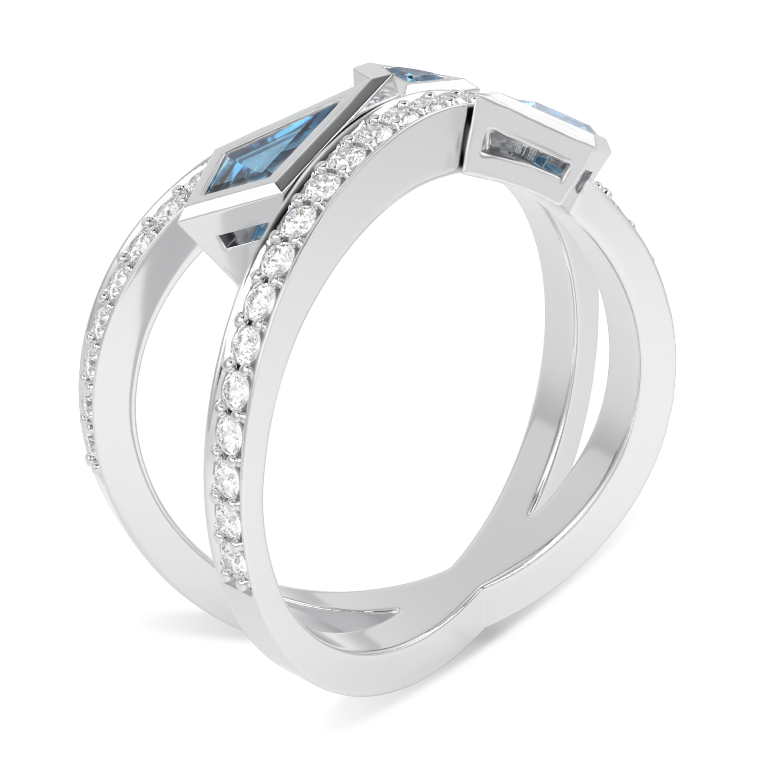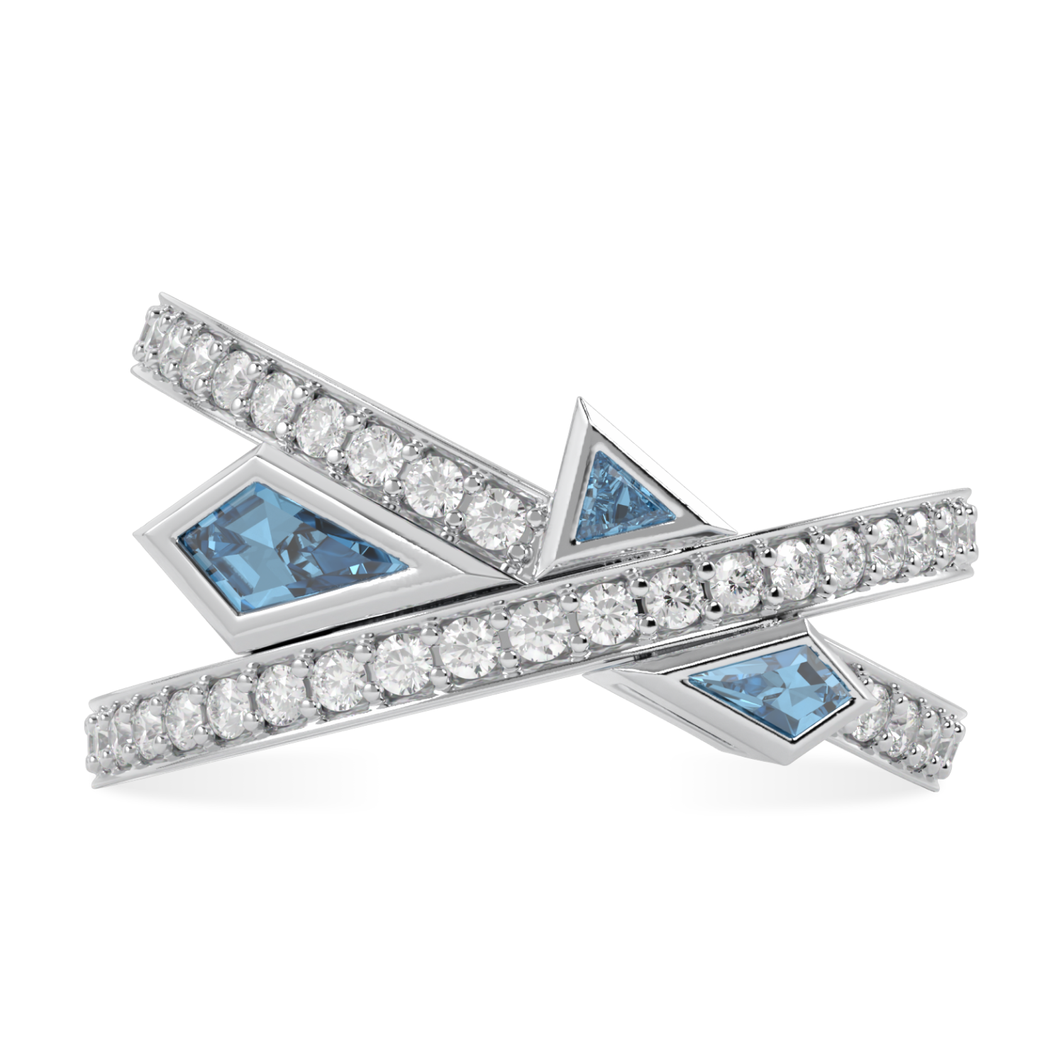 Nestled gracefully amidst diamond-encrusted bands, large kite shaped Brazilian Aquamarines add a touch of sophistication. Drawing inspiration from modernist design, this piece seamlessly melds angular forms and curves for an exquisite aesthetic.