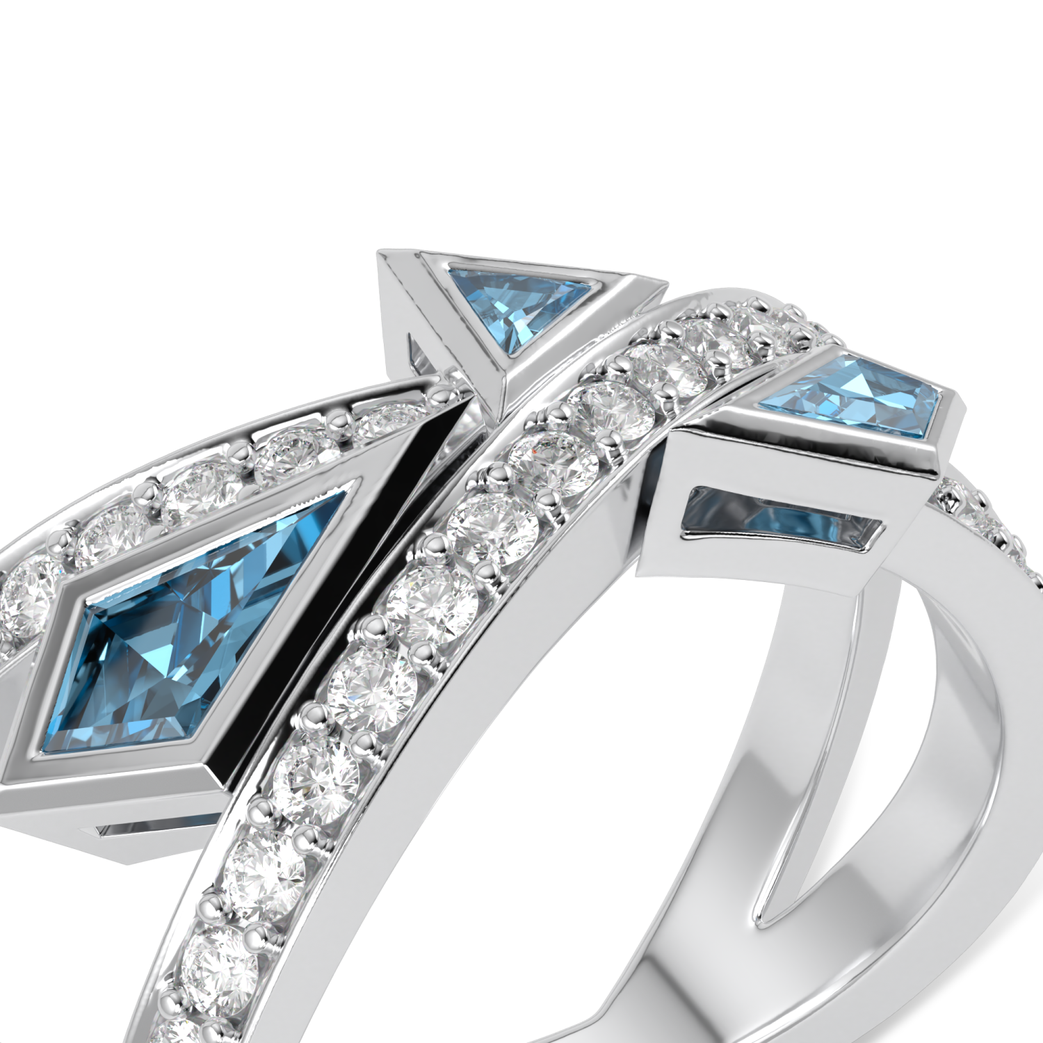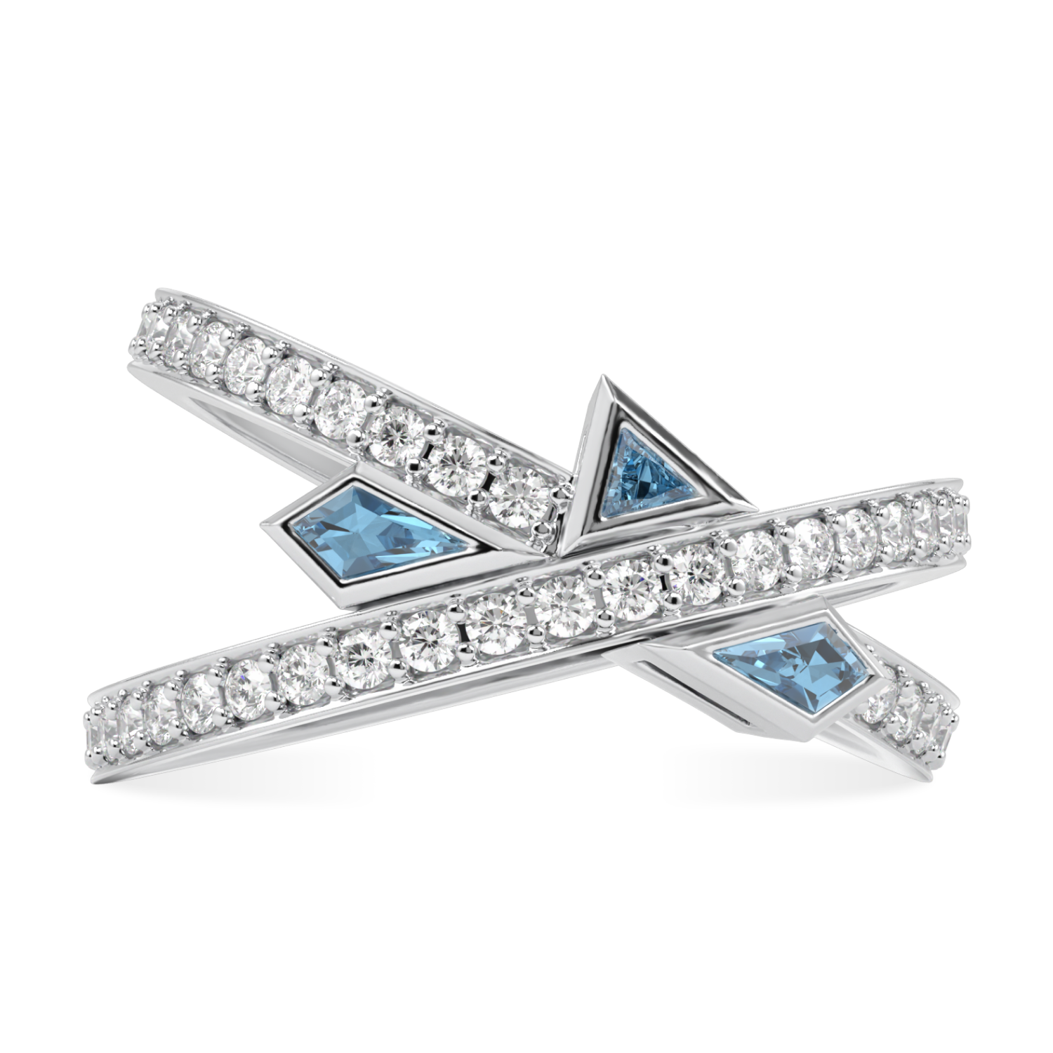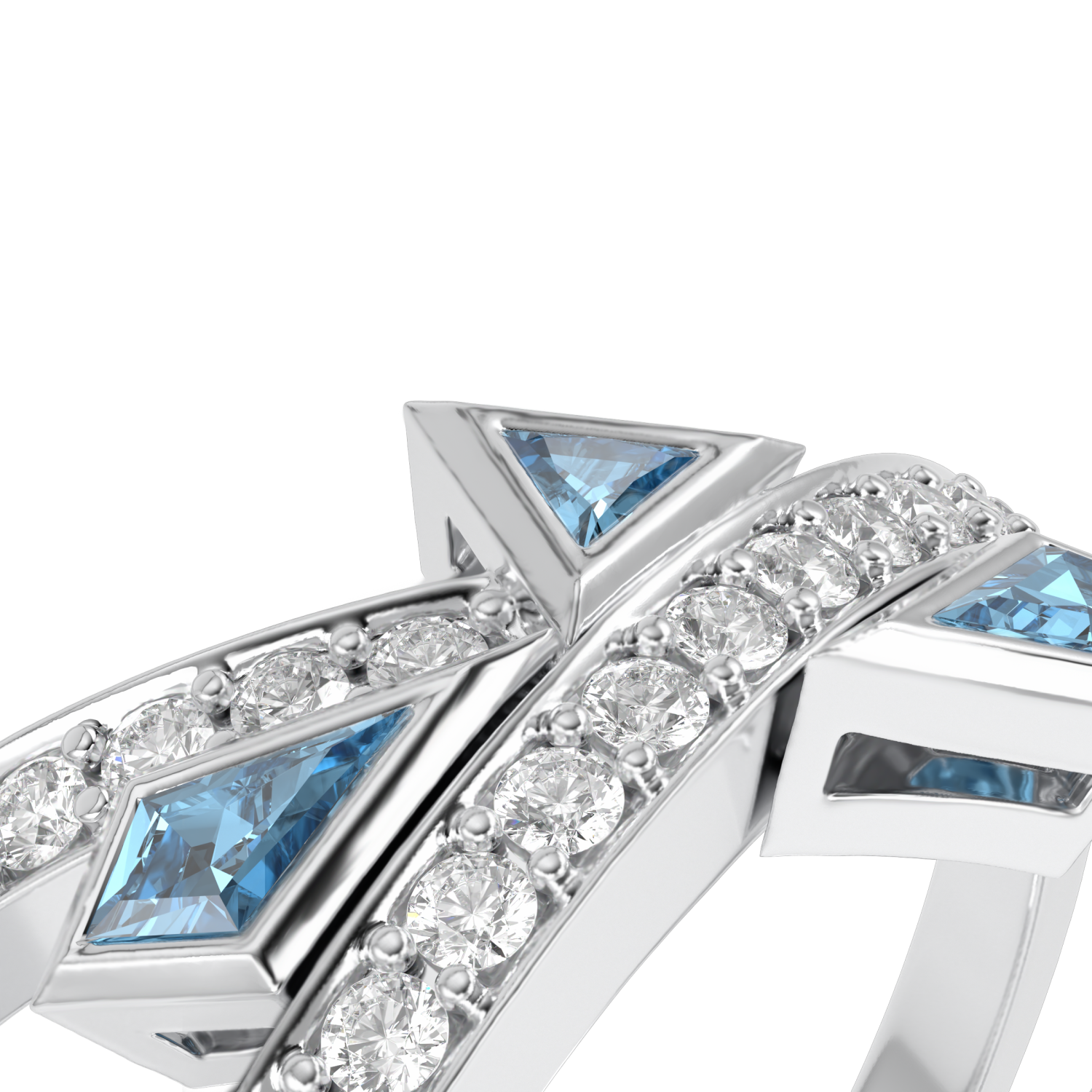 Elegantly positioned between diamond-encrusted bands, specially cut kite-shaped Brazilian aquamarines add a distinctive touch. Inspired by modernist design principles, this piece seamlessly blends angular forms with curves for a sophisticated look.