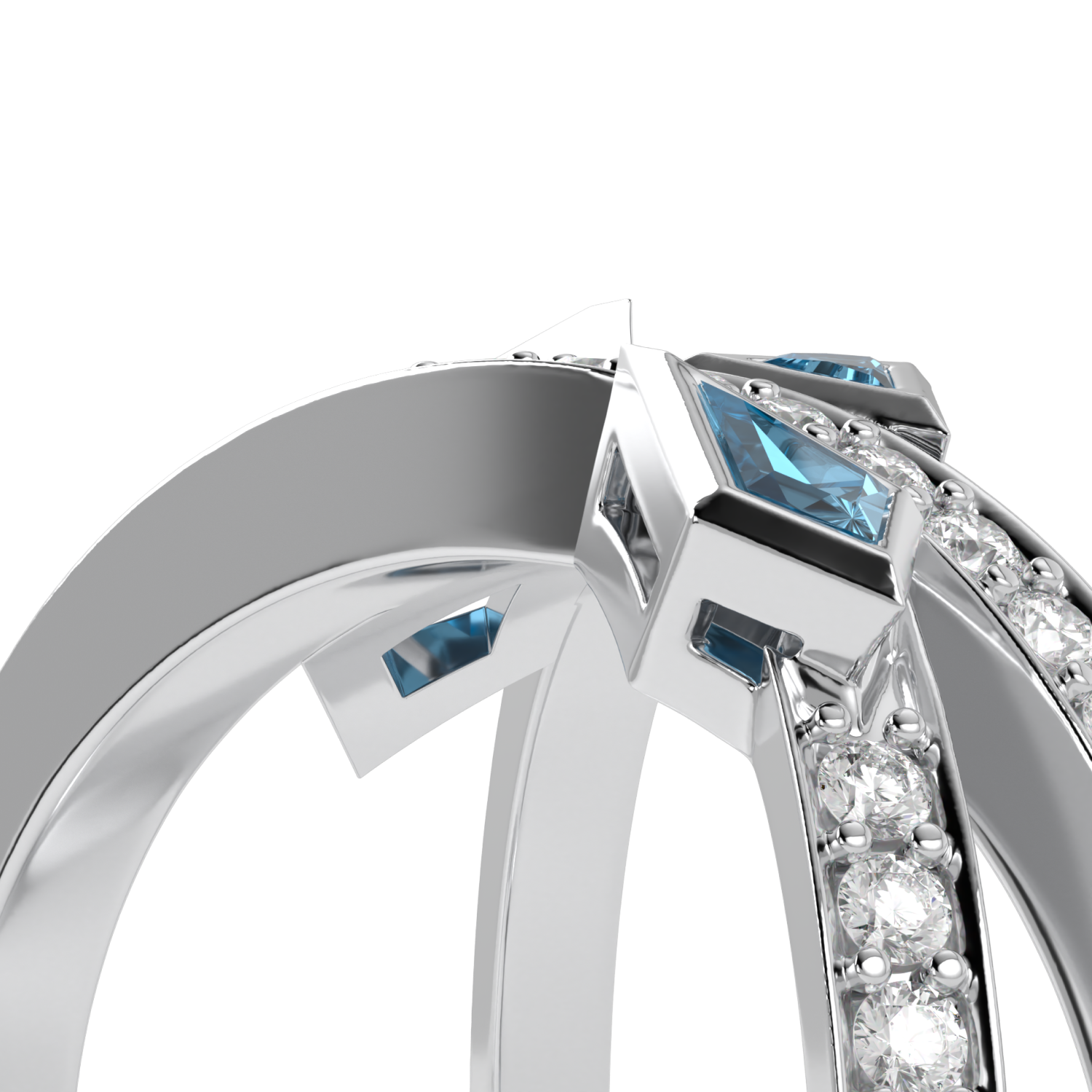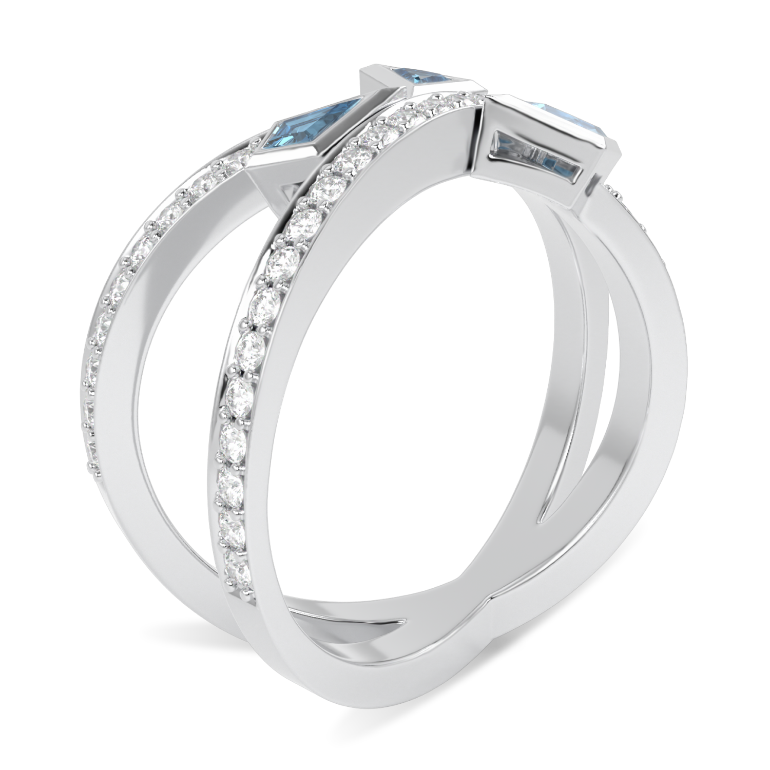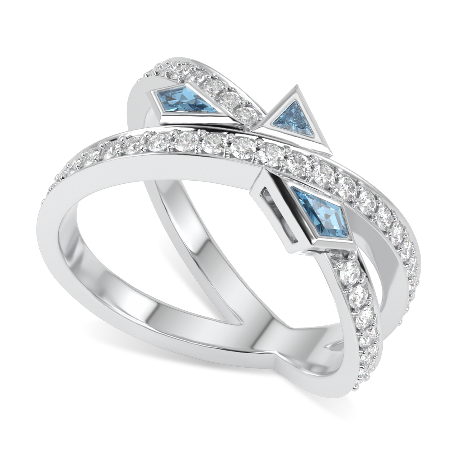 Elegantly positioned between diamond-encrusted bands, specially cut kite-shaped Brazilian aquamarines add a distinctive touch. Inspired by modernist design principles, this piece seamlessly blends angular forms with curves for a sophisticated look.