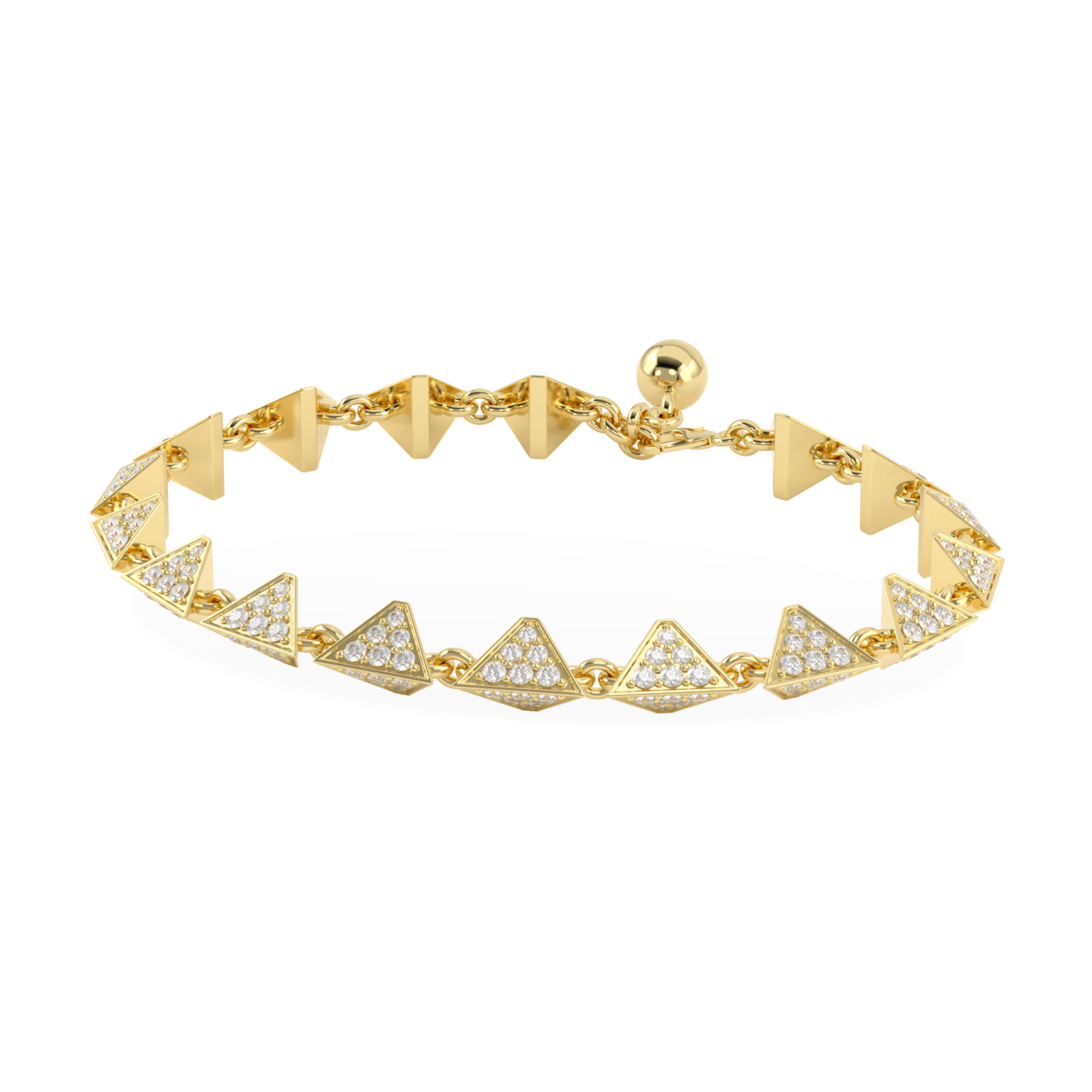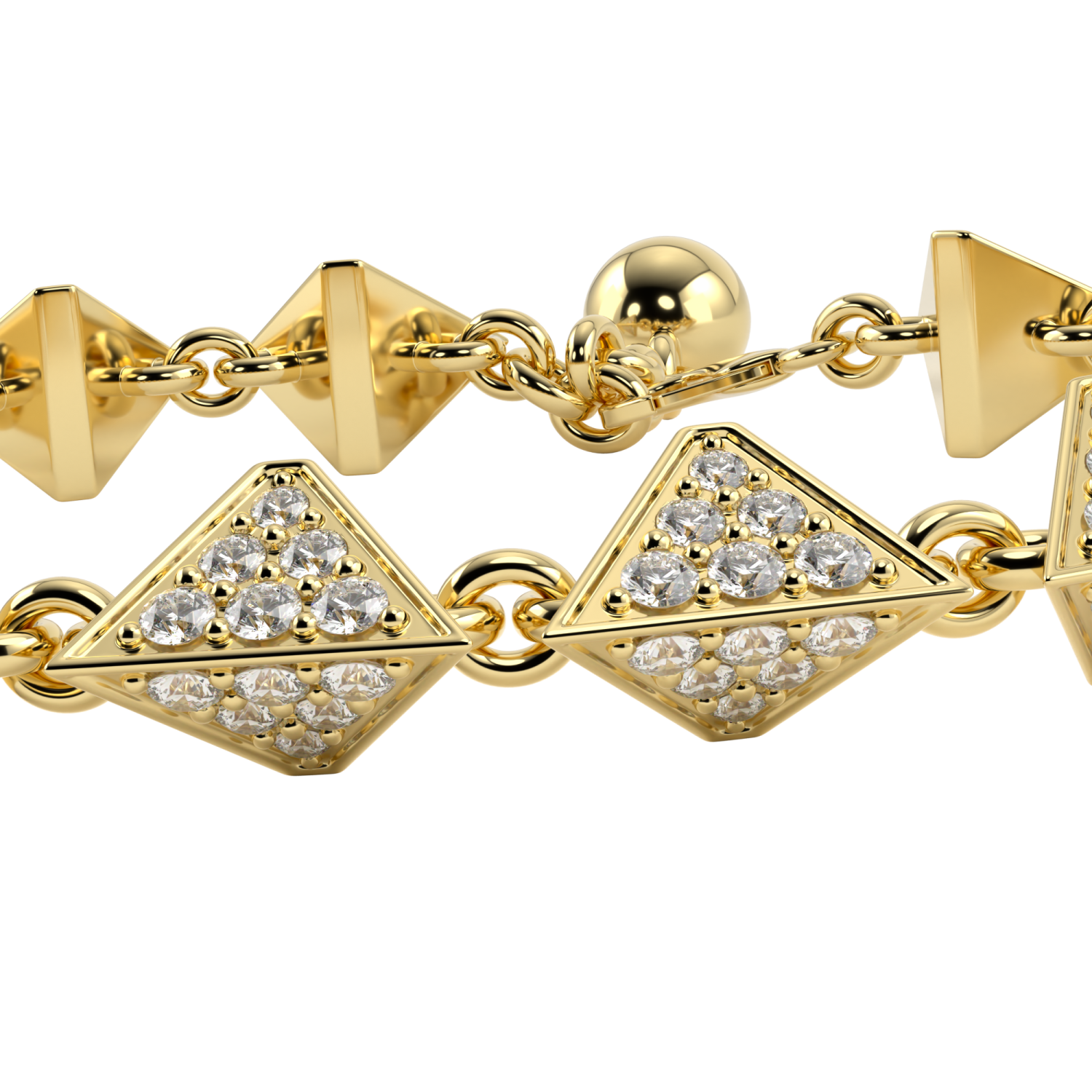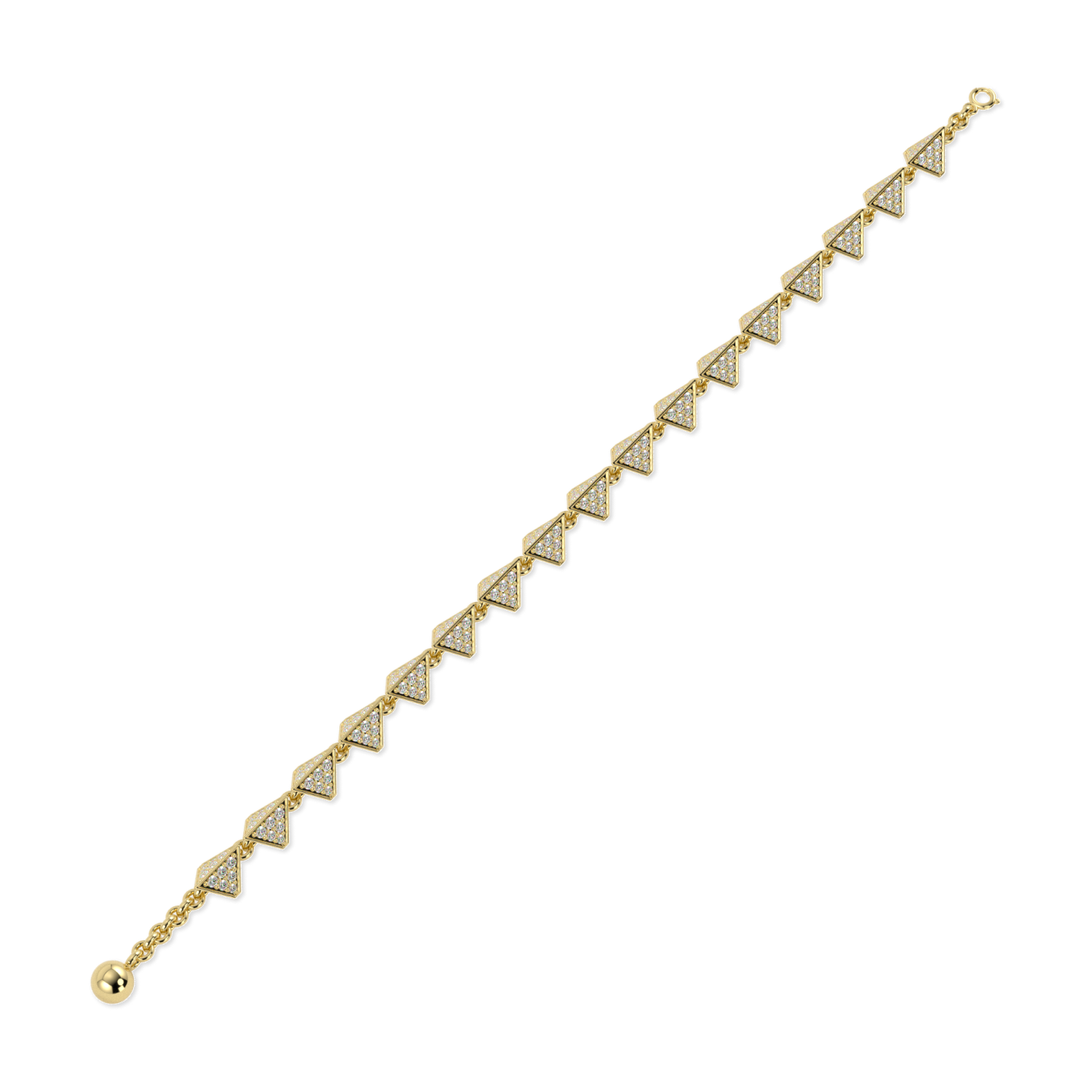 Multiple triangular studs of precision set small diamonds repeat within this radiant link bracelet. Diamond triangular forms repeat within the bracelet, symbolizing the rays of the sun breaking through, making for a very pleasing piece of contemporary fine jewellery. Total carat weight 3.40cts. Finished with an elegant bolt ring and ball charm. Crafted in 18ct yellow gold.