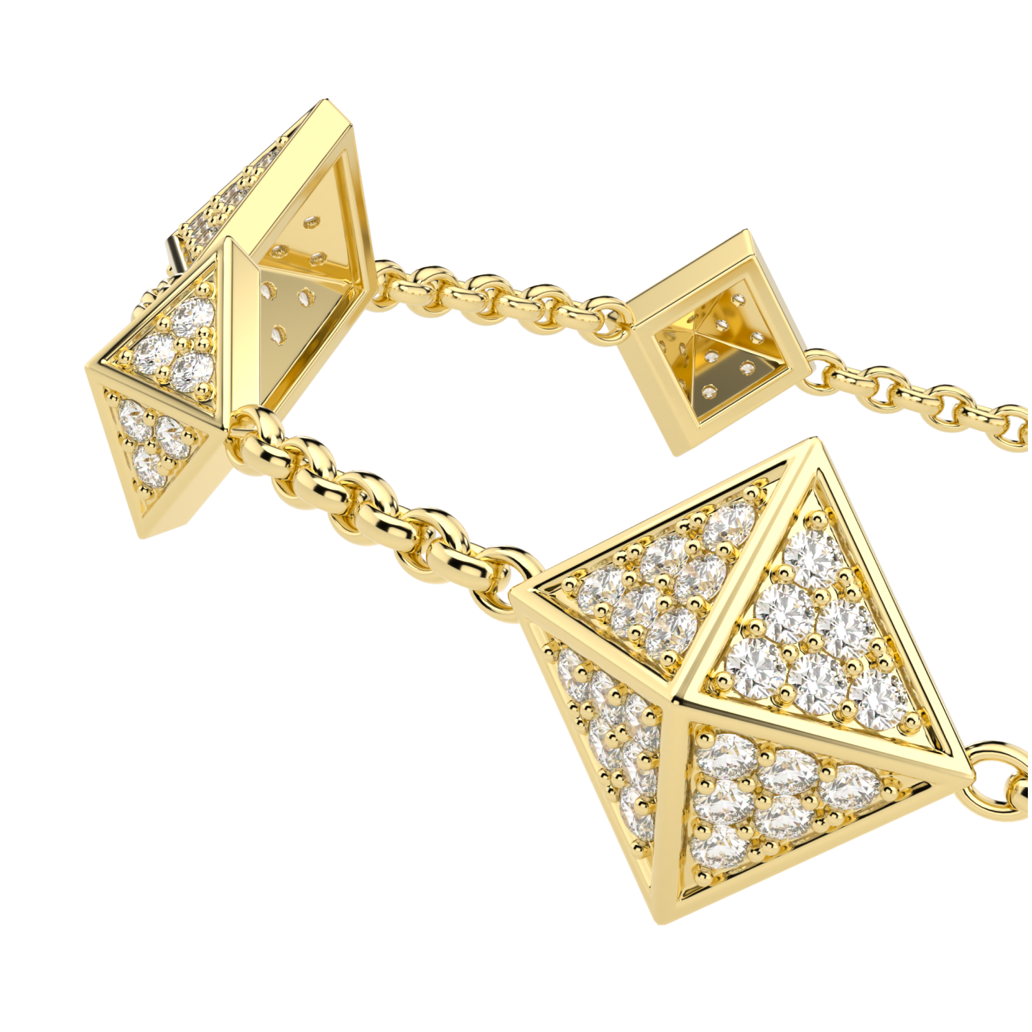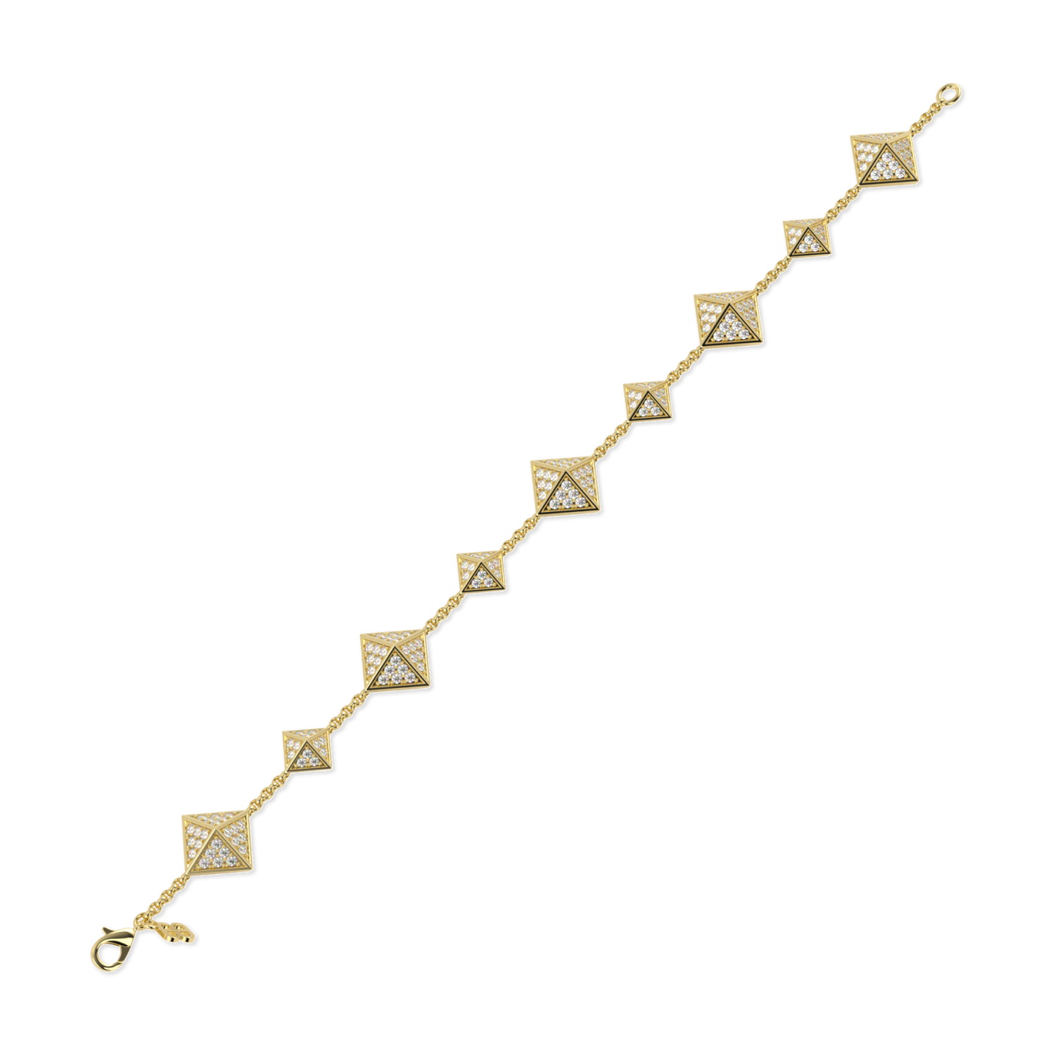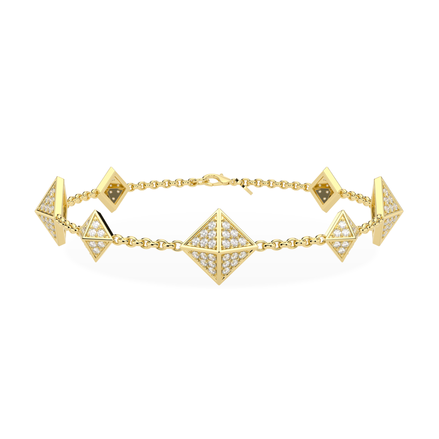 The Origami Diamond chain bracelet features 3 larger elegant diamond set pyramids with 4 supporting smaller diamond set pyramids within a bracelet chain. Like rays of the sun breaking through, this bracelet makes for a very elegant and pleasing piece of contemporary fine jewellery. Total carat weight 1.56cts. All in 18ct yellow gold