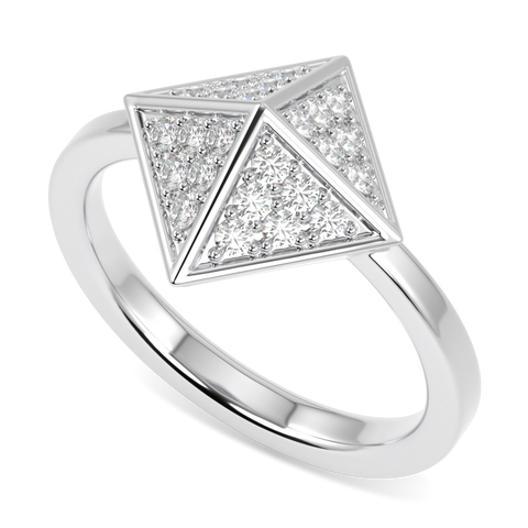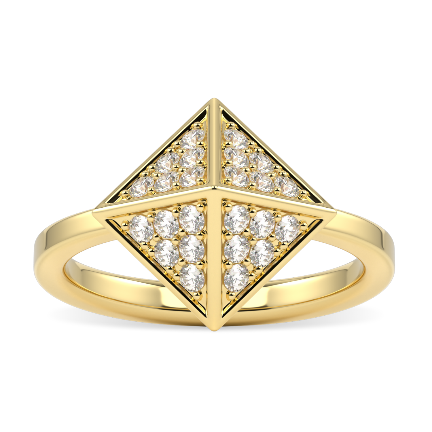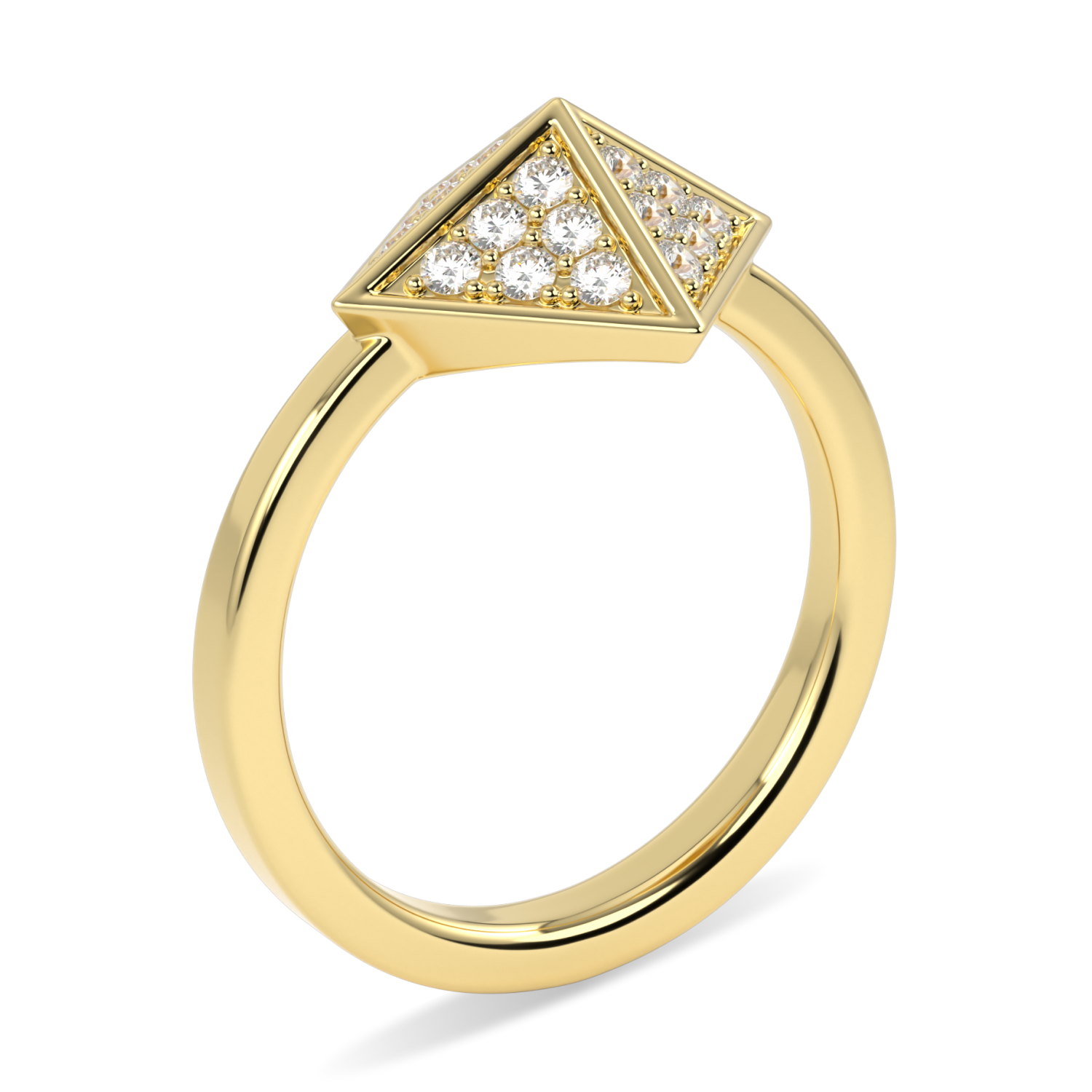 Four triangles of grain-set diamonds converge meticulously to form an elegantly angular ring. The triangular shape, evocative of the sun's descending rays, creates a beautiful and dynamic piece of modern fine jewellery. All in 18ct yellow gold
