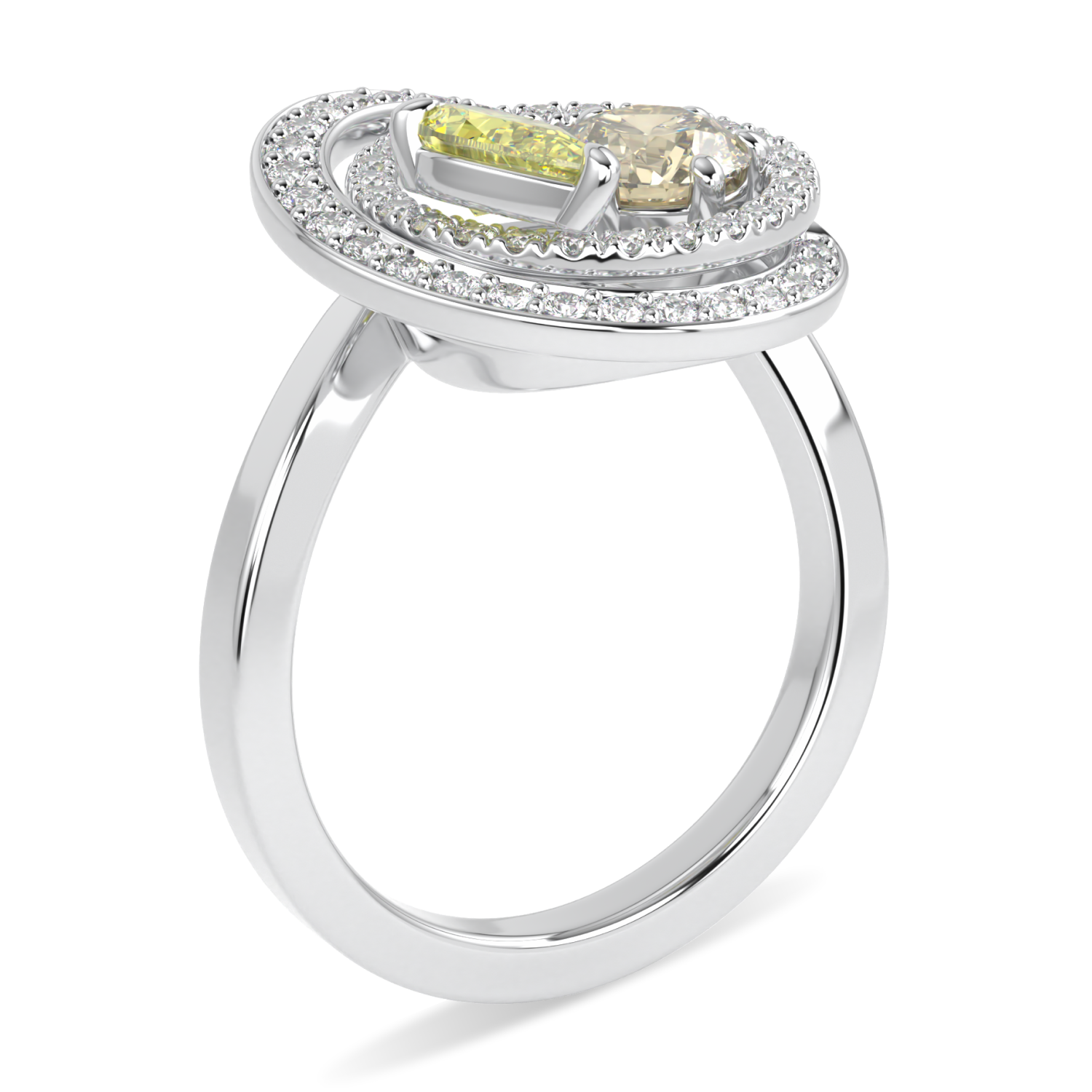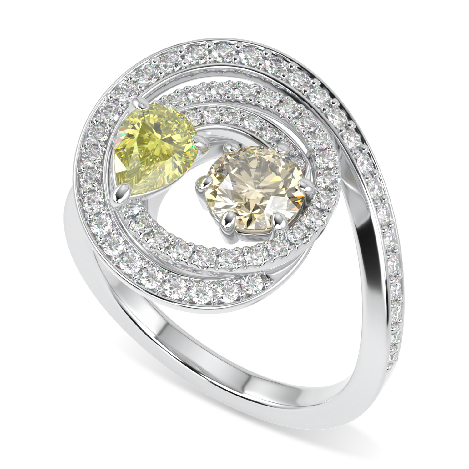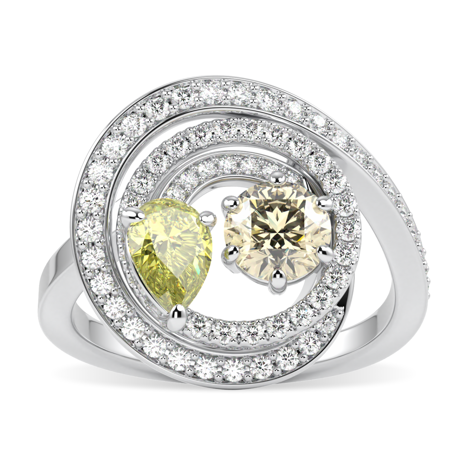 Beautiful sweeping, swirling forms inspired by Capability Brown's landscapes are the centrepiece of this stunning ring. The Serpentine design draws inspiration from the romanticism of an English Summer spent whiling away the time surrounded by nature at its finest. The large ring is set with a 0.50cts pear shaped Fancy Yellow diamond and a 0.46cts round brilliant cut Cape diamond and 0.17cts of round brilliant cut diamonds in 18 carat white gold.