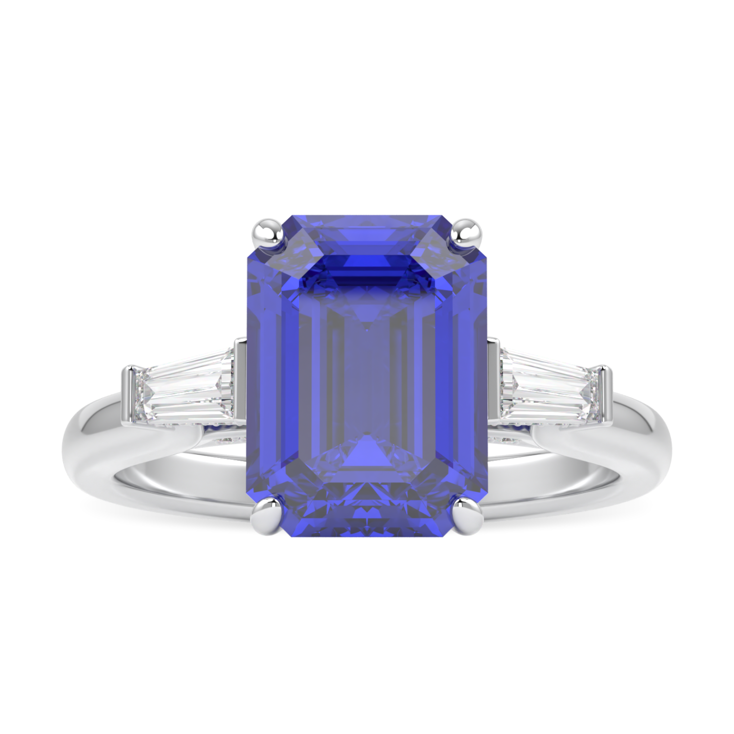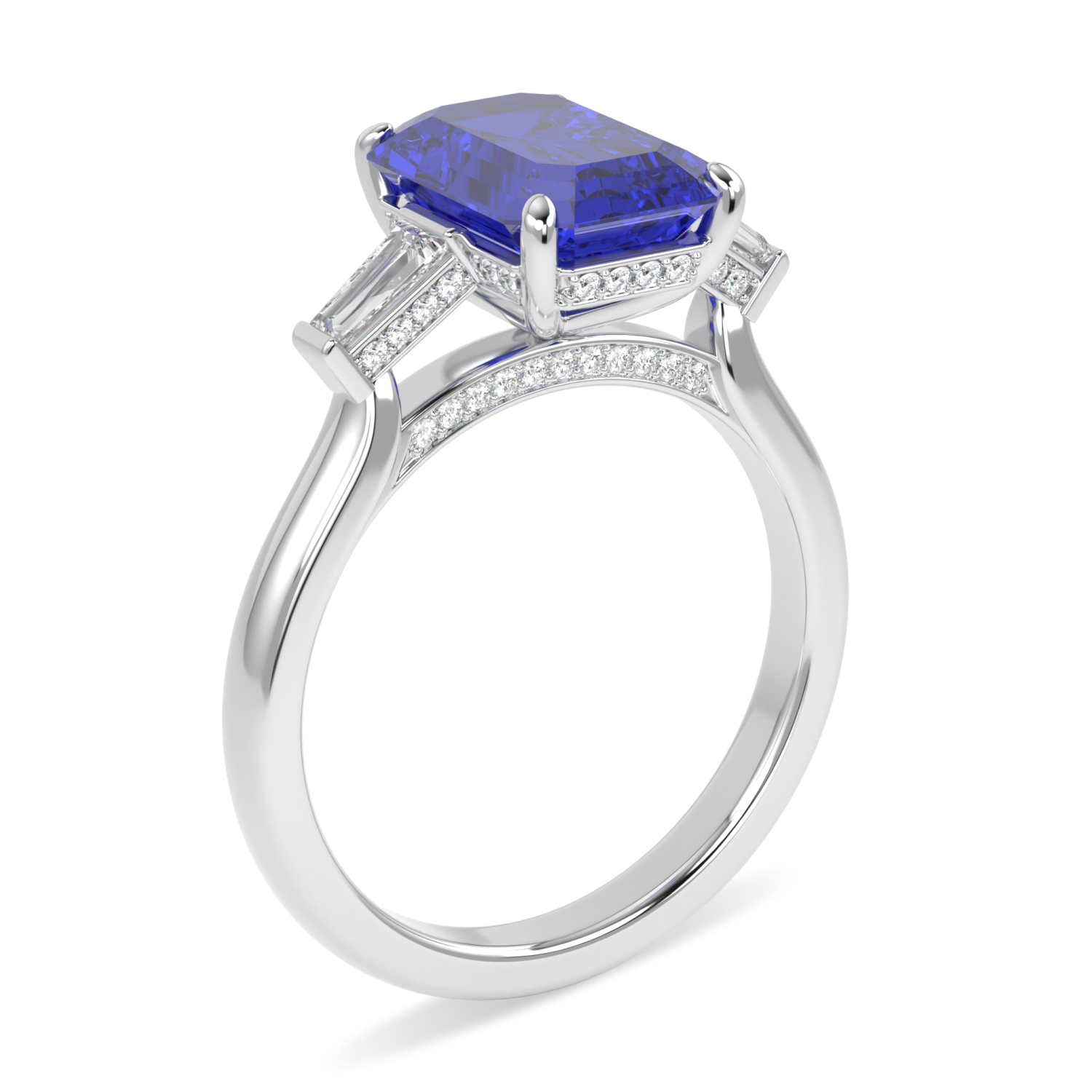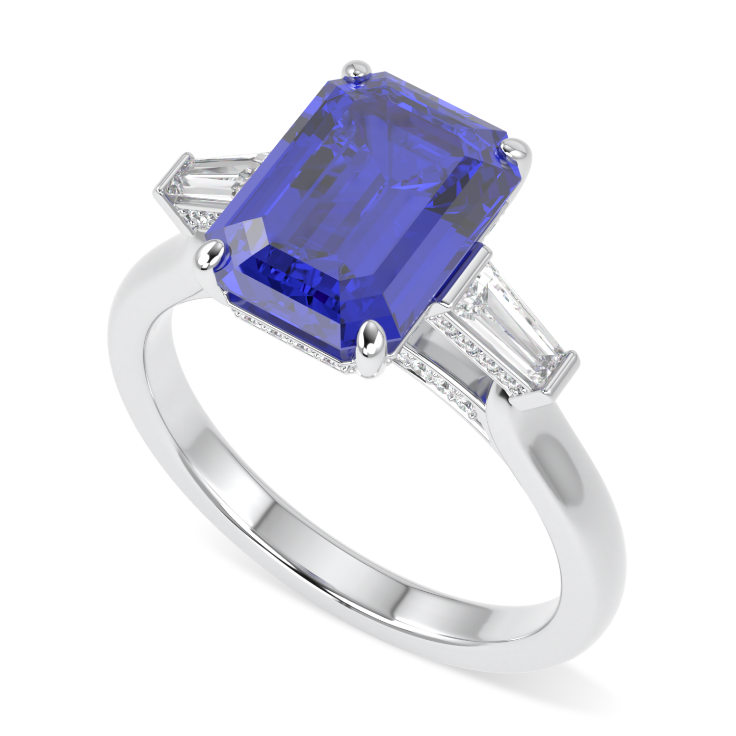 A unique elevated setting showcasing a beautiful 2.60cts stepped cut Royal Blue Sri Lankan sapphire with the sleek elegance of tapered baguettes in the shoulders. All set on a diamond set bridge and head. A statement ring that maximises the beauty of the central sapphire and tapered baguettes.