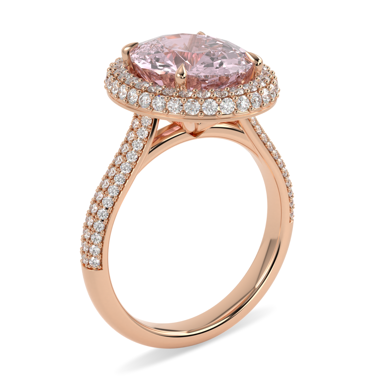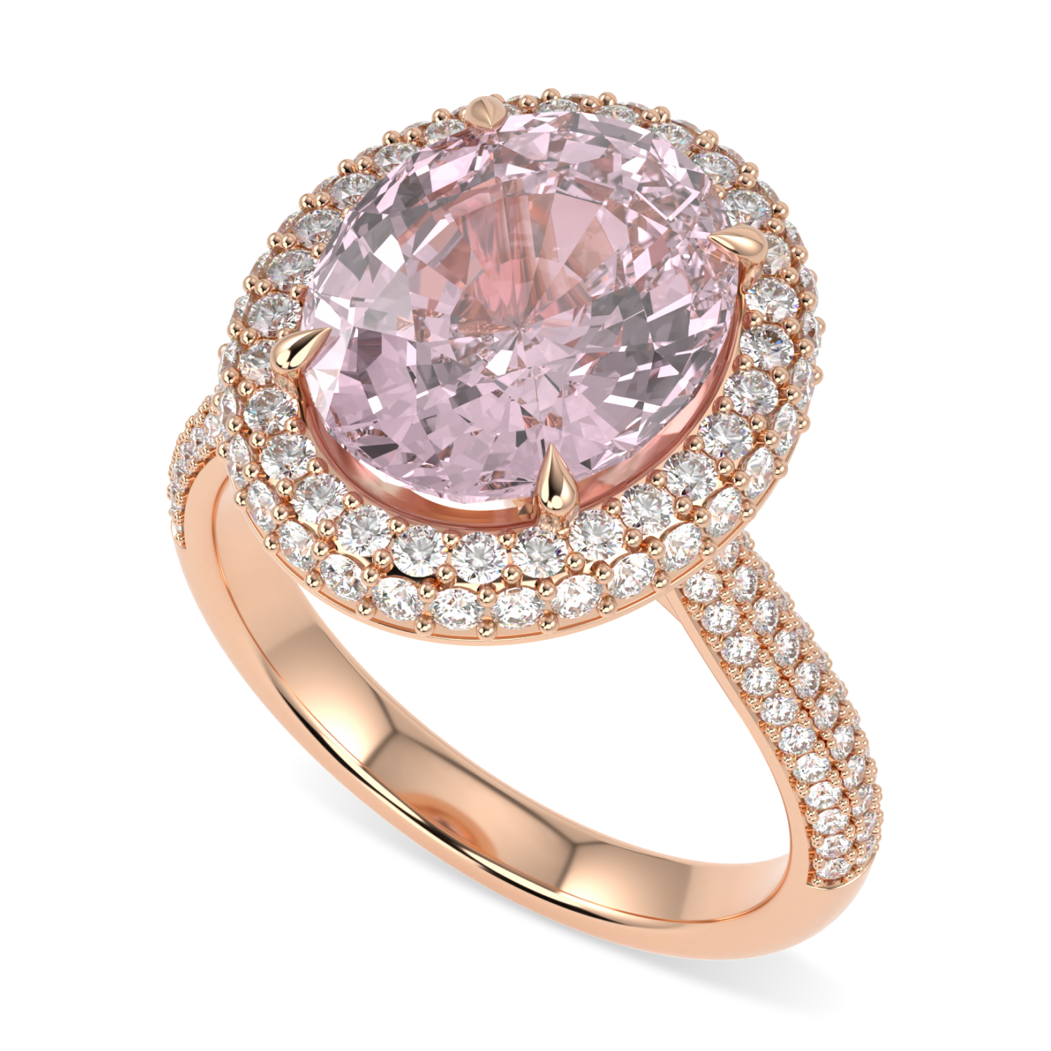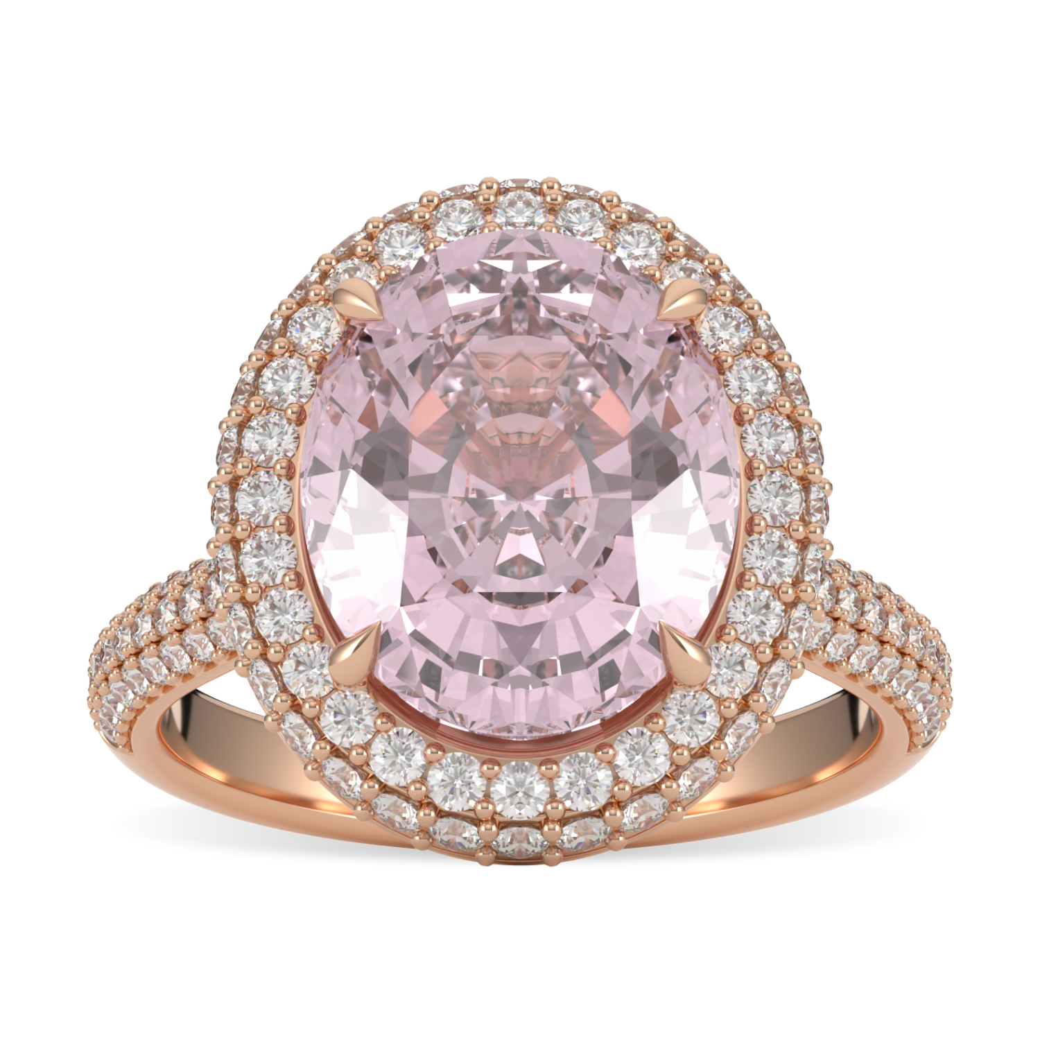 Few achieve the timeless sophistication embodied in the Vintage Morganite Diamond Halo Ring. The mount is set with 0.87cts of pave diamonds. Featuring a delicate 5.50ct baby pink Morganite sourced from Brazil, this piece is crafted in warm 18ct rose gold. With meticulous attention to detail, it epitomizes timeless elegance.