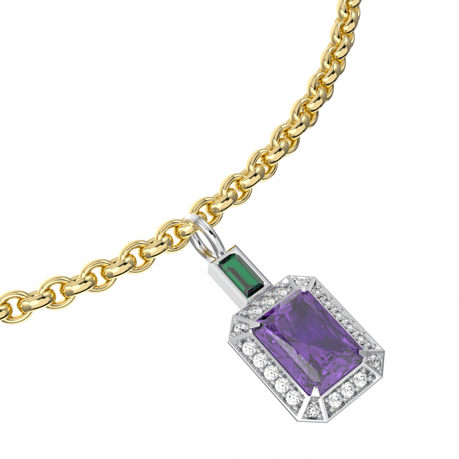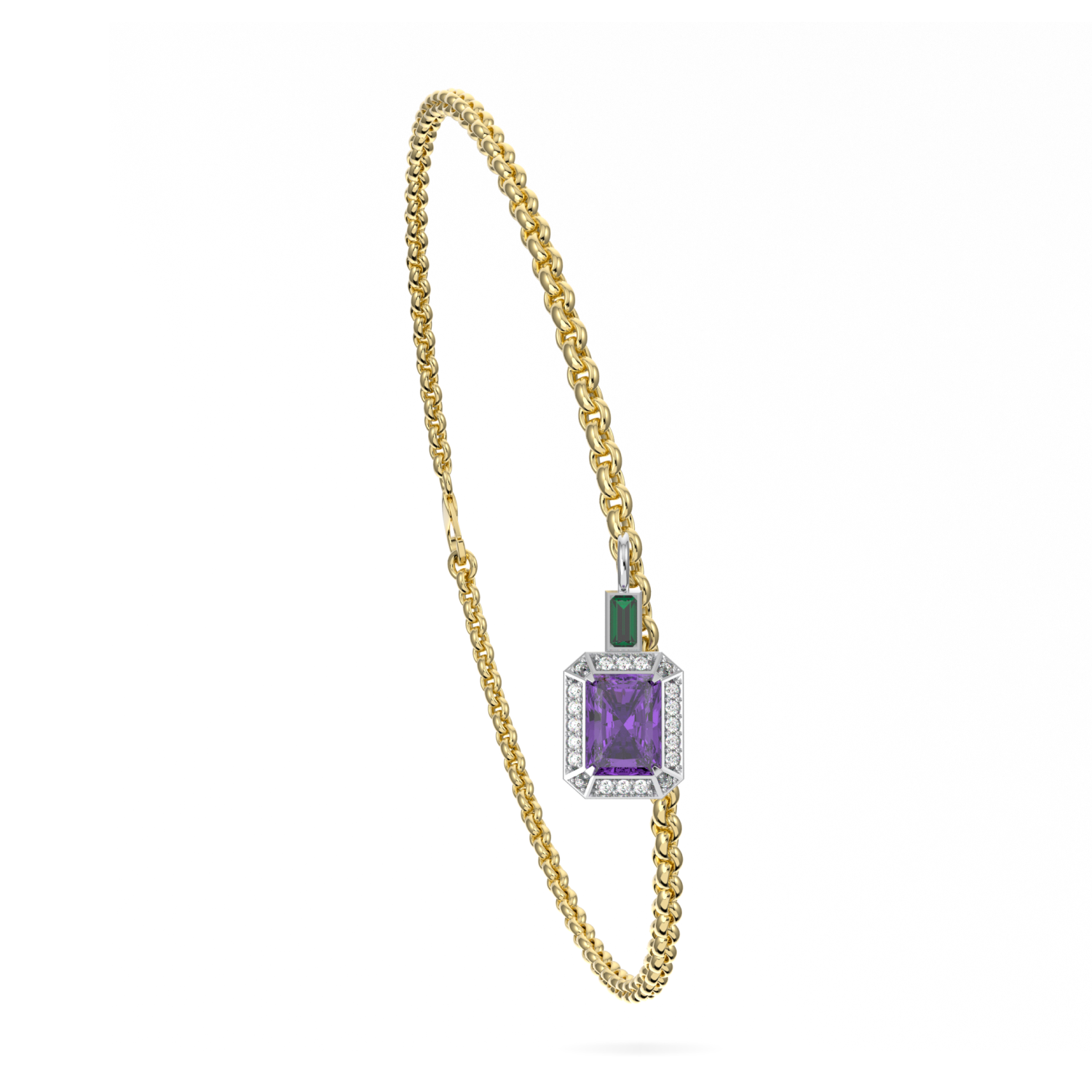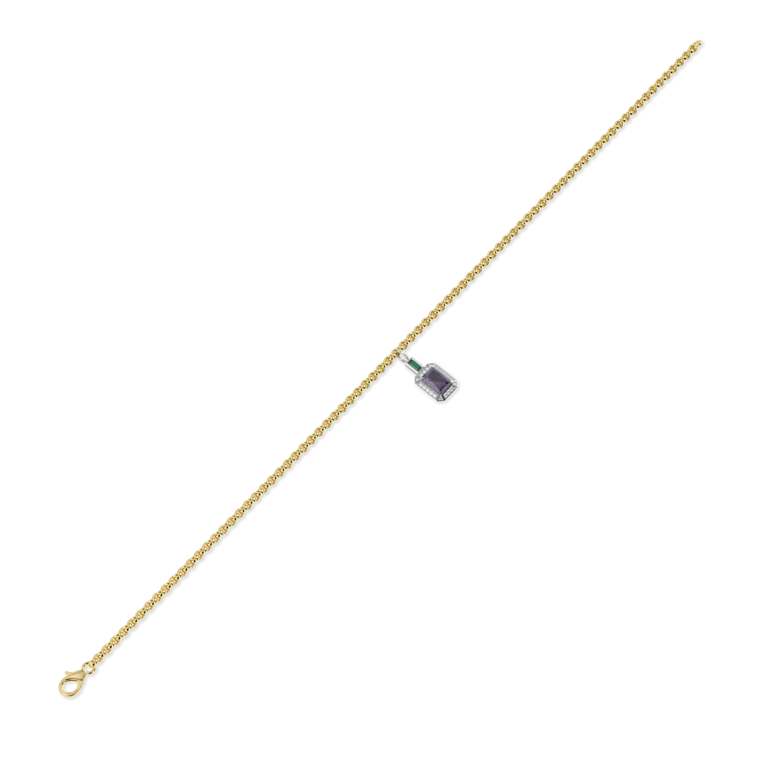 Inspired by the core motif of the Blacklock Empower collection - a vintage halo bracelet features a radiant cut Amethyst surrounded by diamonds, dropping from an emerald baguette. Crafted in 18ct yellow and white gold. Part of the IWD22 Collaboration Capsule collection.
